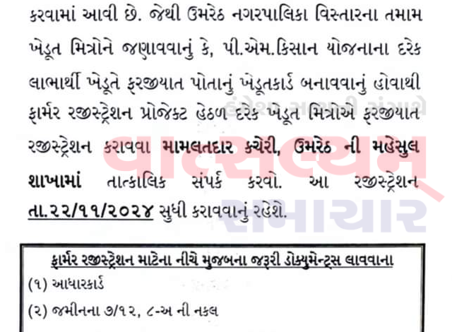 પ્રતિનિધિ : ઉમરેઠ તસ્વીર : કુંજન પાટણવાડીયા ઉમરેઠ મામલતદાર દ્વારા ખેડૂતોને ફાર્મર રજીસ્ટ્રેશન પ્રોજેક્ટમાં રજીસ્ટ્રેશન કરાવવા સંદેશ પહોચાડવામાં આવ્યો.ભારત સરકારશ્રીના…