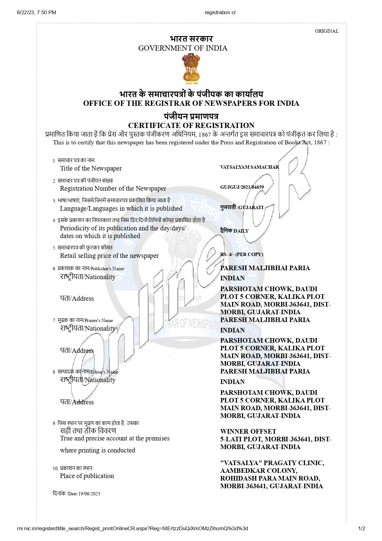 Home/CERTIFICATE/RNI Certificate :GUJGUJ/2021/84659 CERTIFICATE RNI Certificate :GUJGUJ/2021/84659 RNI Number : GUJGUJ/2021/84659 VATSALYAM SAMACHARJune 25, 2024Last Updated: June 25, 2024 36 Less than a minute View Fullscreen RNI CERTIFICATE Sorry, there was a YouTube error. VATSALYAM SAMACHARJune 25, 2024Last Updated: June 25, 2024 36 Less than a minute Facebook X LinkedIn Messenger Messenger WhatsApp Telegram Share via Email Follow Us
