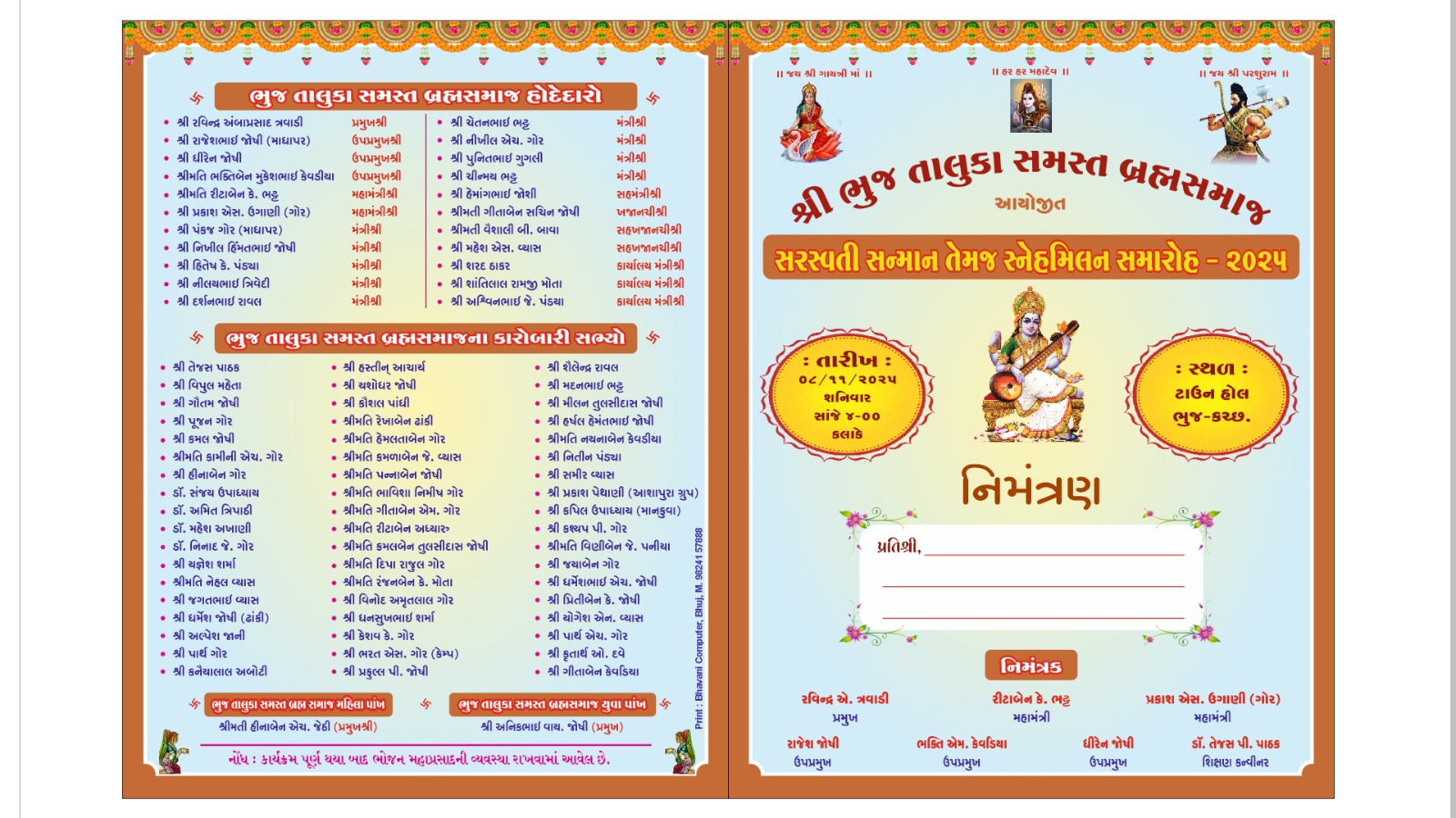 ભુજ,તા-૦૪ નવેમ્બર : સમસ્ત બ્રહ્મ સમાજના શિક્ષણક્ષેત્રે સતત ઉન્નતિ અને પ્રેરણાદાયી કાર્યને બળ આપવા હેતુસર દર વર્ષની જેમ આ વર્ષે પણ શ્રી ભુજ તાલુકા સમસ્ત બ્રહ્મસમાજ દ્વારા તેજસ્વી તારલાઓનું સરસ્વતી સન્માન સમારોહ તેમજ સ્નેહમિલન કાર્યક્રમ ભવ્ય રીતે ઉજવવામાં આવશે.આ કાર્યક્રમ સંવત ૨૦૮૨ કારતક વદ ત્રીજ, શનિવાર તા. ૮ નવેમ્બર, ૨૦૨૫ના રોજ સાંજે ૪-૦૦ કલાકે, ટાઉન હોલ, ભુજ ખાતે યોજાશે. કાર્યક્રમ દરમ્યાન વર્ષ દરમિયાન શૈક્ષણિક ક્ષેત્રમાં ઉત્કૃષ્ટ પ્રદર્શન કરનારા વિદ્યાર્થીઓને પુરસ્કારથી સન્માનિત કરવામાં આવશે.આ તકે બ્રહ્મ સમાજના આગેવાનો, શિક્ષણપ્રેમી દાતાશ્રીઓ તથા ભુજ શહેર અને તાલુકાના પ્રતિષ્ઠિત મહાનુભાવો ઉપસ્થિત રહી વિદ્યાર્થીઓને આશીર્વાદ તથા પ્રોત્સાહન આપશે.સરસ્વતી સન્માન સમારોહ સાથે સ્નેહમિલનનો કાર્યક્રમ પણ યોજાશે, જેના વડે સમાજના સભ્યો વચ્ચે પરસ્પર સૌહાર્દ અને એકતાનો સંદેશ પણ વહેતો રહેશે.ભુજ તાલુકા સમસ્ત બ્રહ્મસમાજે સમાજના તમામ સભ્યો, વિધાર્થીઓ સહ વાલીગણ અને શુભેચ્છકોને આ પ્રસંગે સહપરિવાર ઉપસ્થિત રહી આ ઉજવણીને વધુ ઉજ્જવળ બનાવવા માટે હાર્દિક આમંત્રણ પાઠવ્યું છે, એમ ભુજ તાલુકા સમસ્ત બ્રહ્મસમાજ પ્રમુખ રવિભાઈ ત્રવાડીની યાદીમાં જણાવાયું છે.
