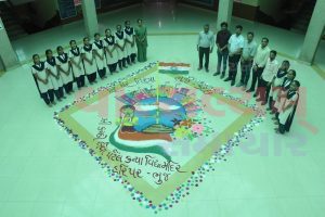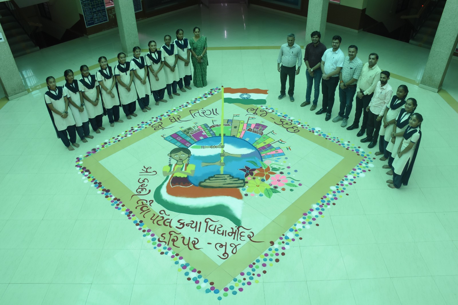 ભુજ,તા-૧૦ ઓગસ્ટ : કચ્છ જિલ્લામાં ૧૩ ઓગસ્ટ સુધી “હર ઘર તિરંગા” અભિયાન અંતર્ગત “તિરંગા યાત્રા”ના વિવિધ કાર્યક્રમોનું આયોજન કરવામાં આવ્યું છે. સમગ્ર કચ્છ જિલ્લામાં આવેલી વિવિધ શાળાઓ, હાઈસ્કૂલોમાં તિરંગાની થીમ ઉપર વિવિધ રંગોળી તૈયાર કરવામાં આવી રહી છે. આવી જ એક સુંદર રંગોળી જિલ્લા સેવા સદન, જિલ્લા કલેક્ટરશ્રીની કચેરી ખાતે શ્રી કચ્છી લેઉવા પટેલ કન્યા વિદ્યામંદિર હરિપર ભુજની બાલિકાઓ દ્વારા તૈયાર કરવામાં આવી છે. નિવાસી અધિક કલેક્ટરશ્રી મિતેશ પંડ્યાએ કલેક્ટર ઓફિસ પરિસરમાં સુંદર રંગોળી તૈયાર કરવા બદલ બાલિકાઓના ઉજ્જવળ ભવિષ્યની કામના કરીને તેમની કલાને બિરદાવી હતી. આ પ્રસંગે ભુજ પ્રાંત અધિકારીશ્રી અનિલ જાદવ, નાયબ જિલ્લા ચૂંટણી અધિકારીશ્રી મેહુલ દેસાઈ, એજ્યુકેશન ઈન્સ્પેક્ટરશ્રી પૃથ્વિરાજ ઝાલા, મદદનીશ શિક્ષક નિરીક્ષક મૂળજીભાઈ સહિત બાલિકાઓ ઉપસ્થિત રહી હતી.