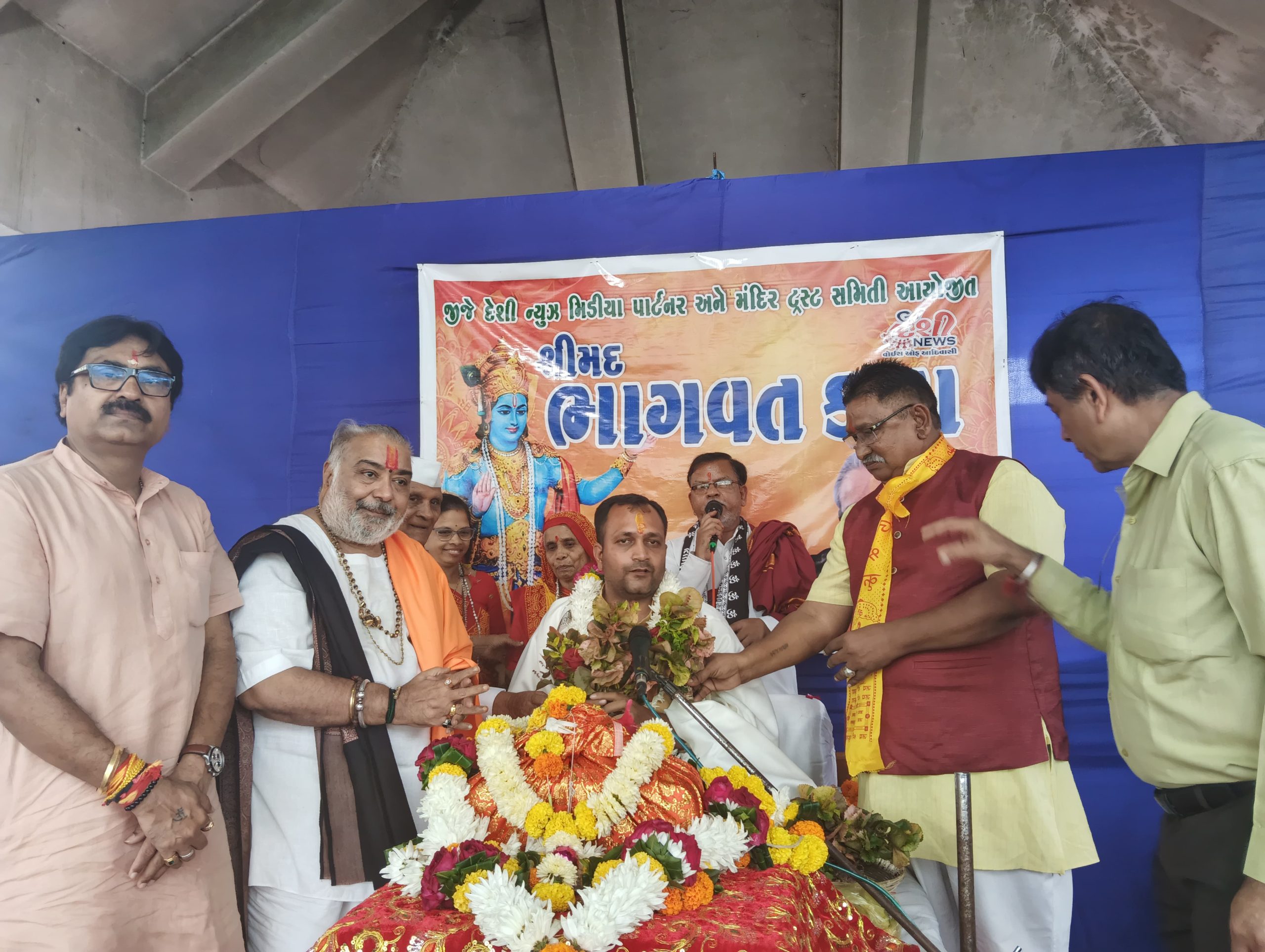 ખેરગામ ના આચાર્ય કશ્યપભાઈ જાની ને ઉનાઈ માં ” કથાકાર ” ની દીક્ષા આપવામાં આવી /તીર્થંધામ ઉનાઈ માતા મઁદિરે કથાકાર પ્રફુલભાઇ શુક્લ ની ભાગવત કથાના મઁગલ આરંભે આજે ખેરગામ ના કર્મકાંડ આચાર્ય કશ્યપભાઈ ભાણાભાઈ જાની ને ” કથાકાર ” ની દીક્ષા પ્રફુલભાઈ શુક્લ અને પૂજ્ય પ્રભુદાદા દ્વારા આપવામાં આવી હતી આ પ્રસંગે દેવનારાયણ ધામ મોતાં ના તારાચંદ બાપુ, કિશોરસિંહ રાજપુરોહિત, નવસારી જિલ્લા ભા,જ, પ, ઉપ પ્રમુખ અશોકભાઈ ગજેરા રસિકભાઈ ટાક, બિપીનભાઈ પરમાર, હરિશભાઈ પરમાર, અને શિવપરિવાર ના આગેવાનો ઉપસ્થિત રહ્યા હતા કથા ના આયોજક શૈલેષભાઇ પટેલે મેહમાનો નું સ્વાગત કર્યું હતું,આચાર્ય રાકેશભાઈ દુબે અને નરેશભાઈ રામાનંદી એ મન્ત્ર ઉચ્ચાર કર્યા હતા આપુર્વે ગીરીશભાઈ જયસ્વાલ ના નિવાસેથી ભવ્ય પોથીયાત્રા નીકળી હતી મુખ્ય યજમાન મહેશભાઈ બાબુભાઇ પાંચિયા વતી જયસ્વાલ પરિવારે પોથી પૂજન કર્યું હતું અશોકભાઈ ગજેરા તરફથી સાત દિવસ ના ભોજન પ્રસાદ ભન્ડારા નો આરંભ થયો હતો નવ નિયુક્ત કથાકાર કશ્યપભાઈ જાની એ ભાગવત કથાનું મહાત્મ્ય વર્ણન કર્યું હતું g j દેશી ન્યૂઝ t, v, પર કથાનું લાઈવ પ્રસારણ કરવામાં આવી રહ્યું છે વિશાલ સઁખ્યામાં લોકો એ કથા શ્રાવણ અને ભોજન પ્રસાદ નો લાભ લીધો હતો કથા નો સમય દરરોજ સવારે 9 થી 12 રાખવામાં આવ્યો છે
