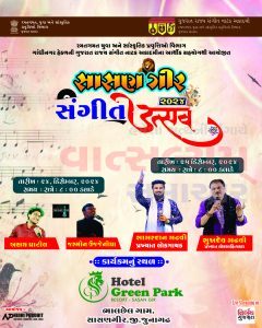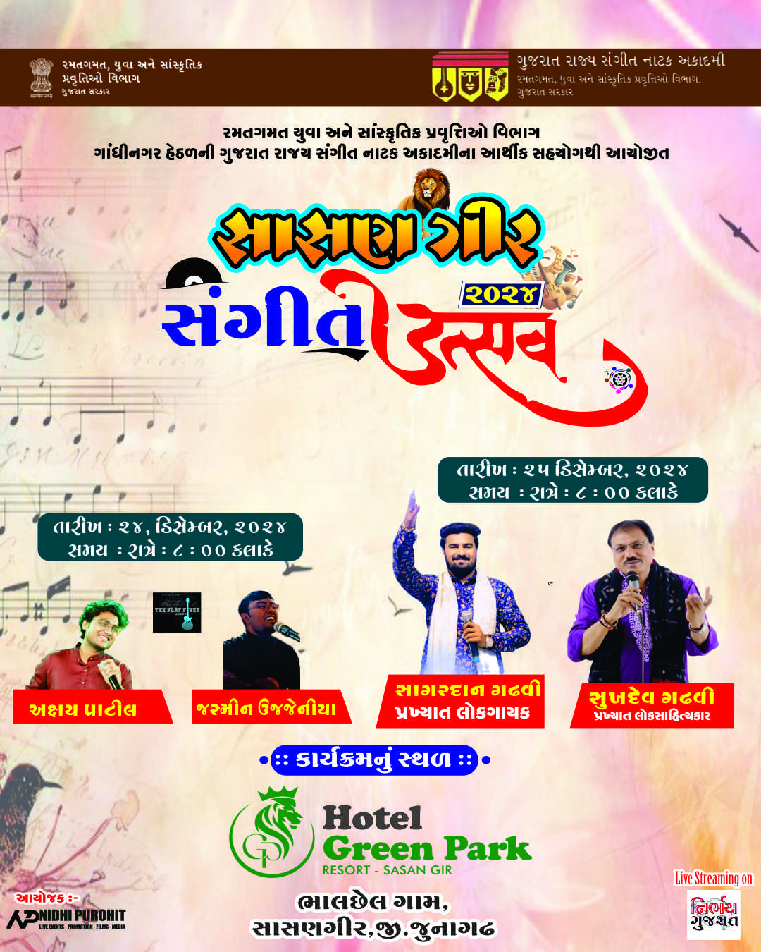 ગુજરાત સરકાર ની સંગીત નાટક અકાદમીના સહયોગથી તા. ૨૪ અને ૨૫ ડિસેમ્બરે સાસણ ગીર ખાતે “સાસણ ગીર સંગીત ઉત્સવ – ૨૦૨૪ નું આયોજન