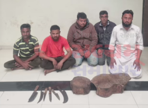 પોલીસે તેમને ઝડપી પાડીને નામઠામ પુછતાં જાવેદમીંયા ઉર્ફે ખેખલી, ફારૂકમીંયા ઉર્ફે લંગડો હબીબમીંયા ઠાકોર, મહંમદ મોહસીનમીંયા ઠાકોર, નવાઝશરીફ યાસીનભાઈ ઠાકોર, મનસુરમીંયા ઈલ્યાસમીંયા ઠાકોર હોવાનું જાણવા મળ્યું હતુ. પોલીસને સ્થળ પરથી ત્રણ છરી, ત્રણ કોયતા, લોખંડની બે ખોરકી, ચાર મોબાઈલ ફોન, રોકડા ૩૯૧૦ સાથે કુલ ૨૬૩૬૦ રૂપિયાનો મુદ્દામાલ મળી આવતાં તે જપ્ત કર્યો હતો. પોલીસે પકડાયેલા શખ્સોની પુછપરછ કરતા કતલ કરાયેલું વાછરડું (ગૌવંશ)તારપુરાથી લાવ્યા હતા અને તેની કતલ કરીને માંસના ટુકડા કરી પાંચેય સરખા ભાગે લઈ જવાના હોવાની કબુલાત કરી હતી.