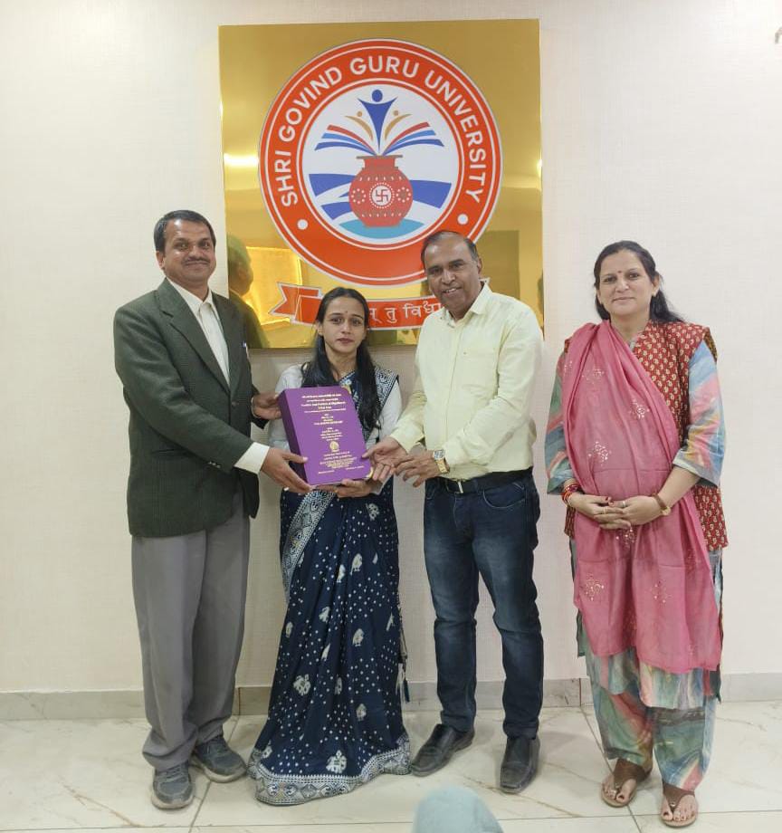 શ્રી ગોવિંદ ગુરુ યુનિવર્સિટી વિંઝોલમાં સમાજશાસ્ત્ર વિષયમાં ડૉ. કામિનીબેન દશોરાના માર્ગદર્શન હેઠળ “આદિવાસી વિસ્તારમાં સ્થાળાંતરની સ્થિતિ અને સમસ્યા (પંચમહાલ જિલ્લાના હાલોલ તાલુકાના સંદર્ભમાં)” પર મહાનિબંધ રજૂ કરીને અંકિતા પટેલે પીએચ.ડી.ની ડીગ્રી પ્રાપ્ત કરી છે.