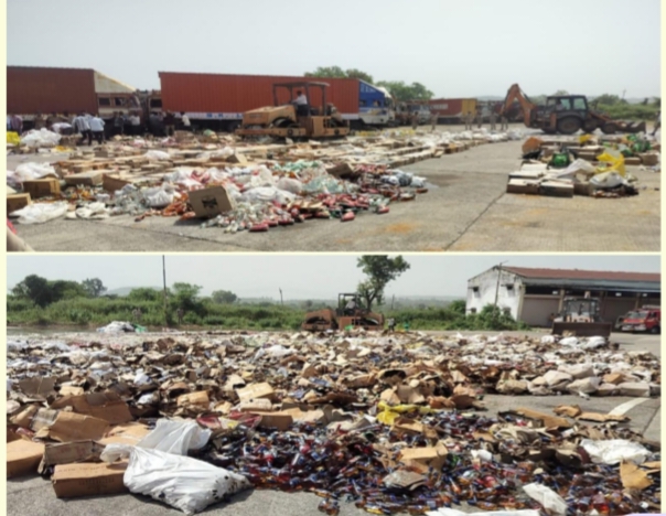 મોડાસા ડિવીજનના મોડાસા ટાઉન, મોડાસા રૂરલ, ઇસરી, મેઘરજ, ભીલોડા, શામળાજી, ટીંટોઈ, પોલીસ સ્ટેશન પોલીસ સ્ટેશનની હદમાં પકડાયેલ વિદેશીદારૂનો જથ્થો નાશ કરવા બાબત નાયબ પોલીસ મહાનિરીક્ષક ગાંધીનગર વિભાગ ગાંધીનગર તથા મનોહરસિંહ એન.જાડેજા, પોલીસ અધિક્ષક, અરવલ્લીનાઓએ અરવલ્લી જીલ્લાના મોડાસા ડીવીજનના પોલીસ સ્ટેશનોમાં પકડાયેલ ગેરકાયદેસર દારૂનો જથ્થો નાશ કરવાની કાર્યવાહી હાથ ધરવા સુચના કરેલ હતી. જે સુચના અન્વયે મોડાસા ટાઉન, મોડાસા રૂરલ, ઇસરી, મેઘરજ, ભિલોડા, શામળાજી, ટીંટોઇ, પોલીસ સ્ટેશનની હદમાંથી પકડાયેલ વિદેશી દારૂનો જથ્થો સેમ્પલ સિવાયનો નાશ કરવા સંલગ્ન નામદાર કોર્ટથી નાશ કરવાની મંજુરી મેળવી તા.૧૦/૧૦/૨૦૨૫ ના રોજ ઉપરોક્ત સાતેય પોલીસ સ્ટેશનના કુલ-૩૮૫ ગુન્હાઓમાં કબજે લેવામાં આવેલ વિદેશી દારૂ/બીયર ટીન નંગ-૧૭૪૧૫૧, કુલ કિ.રૂ.૫,૯૧,૦૫,૭૨૪/- નો શામળાજી સેલટેક્ષની બાજુની ખુલ્લી જગ્યામાં કમિટીના અધ્યક્ષ ડૉ.વી.બી.પટેલ, (GAS) અધ્યક્ષ અને સબ ડીવી. મેજી. મોડાસા વિભાગ, મોડાસા તથા સભ્ય આર.ડી.ડાભી, ઈન્ચાર્જ નાયબ પોલીસ અધિક્ષક, મોડાસા વિભાગ, મોડાસા તથા સભ્ય જે.કે.પટેલ, પોલીસ સબ ઇન્સ્પેક્ટર, નશાબંધી અને આબકારી ખાતુ સાબરકાંઠા-અરવલ્લી તથા સાતેય પોલીસ સ્ટેશનના થાણા અમલદાર ઓ તથા મામલતદાર મોડાસા, ભીલોડા, મેઘરજ, નાઓની રૂબરૂમાં નાશ કરવામાં આવેલ છે.