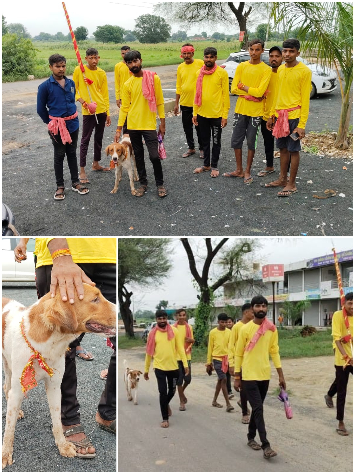 હાલ ભાદરવી પૂનમ નજીક આવિ રહિ છે માઇભકતો પગપાળા અંબાજી મંદિર ખાતે દર્શન માટે ચાલતા નીકળી રહ્યા છે રસ્તાઓ પર સંઘો એક પછી એક પ્રયાણ કરી રહ્યા છે ત્યારે મહીસાગર જિલ્લાનો સંઘ રેલ્લાવાડા ગામ ખાતે આવિ પોહ્ચ્યો હતો જેમાં માઇભક્તો સાથે પ્રાણીઓની પણ અંબાજી પદયાત્રા જૉવા મળી હતી જે મા મેઘરજના રેલ્લાવાડા ખાતે સંઘ સાથે કૂતરો પણ અંબાજી પદયાત્રા માં જોવા મળતા લોકો અચરજમાં પડ્યા હતા હાલ આ સંઘ એ ખાડોદી થી અંબાજી જઈ રહ્યો છે પદયાત્રિકો સાથે કૂતરા એ પણ યાત્રા શરૂ કરી છે છેલ્લા 3 વર્ષ થી ગામ ની સાથે કૂતરો પણ અંબાજી પદયાત્રા માં જોડાયા છે તેવુ જાણવા મળ્યું હતું અને કહ્યું હતું કે કૂતરાને અંબાજી સુધી દર્શન માટે આવશે આમ કૂતરા ની માતાજી પ્રત્યે અનોખી ભક્તિ થી સૌ કોઈને અચરજ પામ્યા હતા