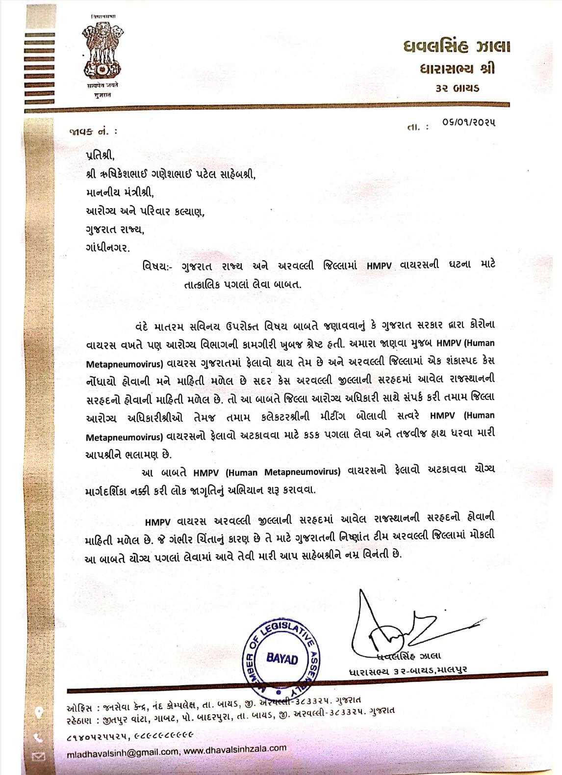 કોરોના વાયરસની મહામારીએ દુનિયાભરમાં હાહાકાર મચાવ્યો હતો કેટલા એ લોકોનો આ મહામારીએ ભોગ લીધો હતો સરકારના અથાગ પ્રયત્નોથી રસીકરણની ઝુંબેશ ચલાવીને આ મહામારીને માંડ કાબુમાં લેવામાં આવી હતી થોડા વિરામ બાદ આવાજ એક ભયંકર વાયરસે દસ્તક દીધી છે આવો જ એક વાયરસનો શંકાસ્પદ કેસ અરવલ્લીમાં નોંધાયો છે એની ગંભીરતા જોતા ભયનો માહોલ જોવા મળી રહ્યો છે ચીનમાંથી ફેલાયેલ એચ એમપીવી વાયરસ ફરીથી દેશભરમાં ના ફેલાય તે હેતુથી લોકોમાં જાગૃતિ લાવવા માટે બાયડ માલપુર ધારાસભ્ય ધવલસિંહ ઝાલાએ આરોગ્ય અને પરિવાર કલ્યાણ મંત્રીમંત્રી ને પત્ર દ્વારા સાવચેતીના પગલા રૂપે ગુજરાતના તમામ આરોગ્ય વિભાગ કચેરીઓને જાણ કરીને સલામતીના પગલાં લેવા માટે જાણ કરી છે તેમજ આરોગ્ય અધિકારીઓ સાથે મીટીંગ કરીને સલામતીના ભાગરૂપે તાત્કાલિક અસરથી સલાહ સૂચનો કરવા પત્ર દ્વારા જણાવવામાં આવ્યું છે