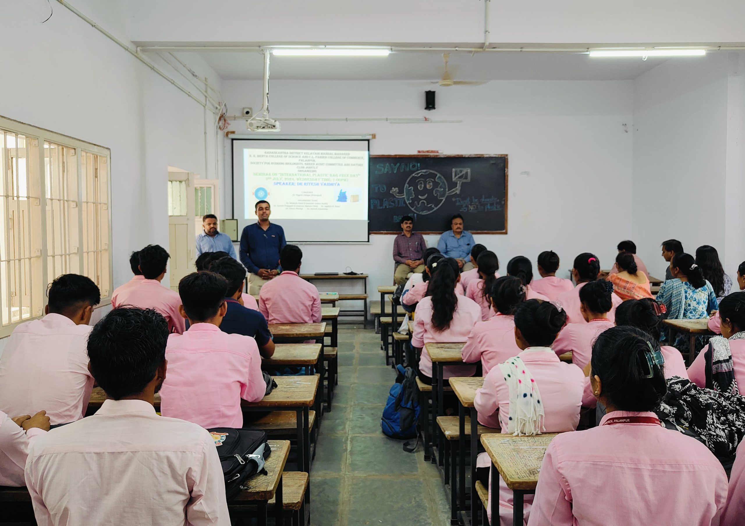 બનાસકાંઠા ડિસ્ટ્રિકટ કેળવણી મંડળ સંચાલિત આર આર મહેતા કૉલેજ ઑફ સાયન્સ એન્ડ સી એલ પરીખ કૉલેજ ઑફ કોમર્સ, પાલનપુર ખાતે સોસાયટી ફોર બડિંગ બાયોલોજીસ્ટ, ગ્રીન ઓડિટ કમિટી તથા નેચર ક્લબ ના સંયુક્ત ઉપક્રમે તારીખ ૩-૭-૨૦૨૪ ને બુધવાર ના રોજ બપોરે ૧૨:૩૦ કલાકે ઇન્ટરનેશનલ પ્લાસ્ટિક ડે ઉજવણી નિમિતે પ્લાસ્ટીકના નિયંત્રિત ઉપયોગ માટે એક સેમિનારનું આયોજન કરવામાં આવેલ. કાર્યક્રમની શરુઆત સમુહ પ્રાર્થનાથી કરવામાં આવી. સંસ્થાના પ્રિન્સિપાલ ડૉ. વાય. બી. ડબગર સાહેબે સ્વાગત પ્રવચન કેં જેમાં ફક્ત પ્લાસ્ટીક અને તેના ઉપયોગની જાગૃતિ નહિ પરંતુ અમલીકરણનો આગ્રહ રાખ્યો. ડૉ. રીતેષભાઈ વૈદ્ય (પ્રિન્સિપાલ સાયન્સ ફેકલ્ટી: ગોકુલ ગ્લોબલ યુનિવર્સિટી) કાર્યક્રમમાં મુખ્ય વક્તા તરીકે ઉપસ્થીત રહીને તેઓએ મૂળ પ્લાસ્ટીક બંધારણ, તેના પ્રકાર સાથેના નિયંત્રિત ઉપયોગો સહિત રોજિંદા જીવનમાં કઈ રીતે તેનો Reuse, Reduce, Recycle, Remove કરી શકાય તેની રસપ્રદ માહિતી આપી. દરેક સ્પર્ધક દ્વારા ઓછામાં ઓછા પ્લાસ્ટીકના ઉપયોગ તથા તેની જાગૃતી સમાજ સુધી પહુંચે તેવી પ્રતિજ્ઞા પણ લીધેલ. આ કાર્યક્રમમાં ડૉ. મુકેશ પટેલ, ડૉ. જે એન પટેલ, ડૉ. એસ. આઈ. ગટીયાલા, ડૉ. હરેશ ગોંડલિયા, ડૉ. અમી પટેલ, પ્રો. પૂજા મેસુરાણી, કુ. અંકિતા કુગશિયા ઉપસ્થિત રહ્યા. સમગ્ર કાર્યક્રમનું સફળ આયોજન શૈક્ષણિક કમિટીની સૂચના મુજબ ટી. વાય. બોટનીના વિધાર્થી સ્વયંસેવકો દ્વારા તથા સફળ સંચાલન બોટની વિભાગના આસિસ્ટન્ટ પ્રોફેસર ડૉ. ધ્રુવ પંડયા દ્વારા કરવામાં આવ્યું. કાર્યક્રમનો અંત રાષ્ટ્રગીત દ્વારા કરવામાં આવ્યો.
