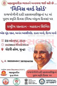 મુન્દ્રા, તા – 21 ઓગસ્ટ : અહીંના પ્રજાપિતા બ્રહ્માકુમારી ઈશ્વરીય વિશ્વ વિદ્યાલયના સમાજસેવા પ્રભાગ દ્વારા બ્રહ્માકુમારીઝ સંસ્થાના મુખ્ય ભૂતપૂર્વ પ્રશાસિકા રાજયોગિની દાદી ડો. પ્રકાશમણિજીની 18મી પુણ્યતિથિ તેમજ વિશ્વ બંધુત્વ દિવસ નિમિત્તે રાષ્ટ્રીય મહા રક્તદાન કેમ્પનું આયોજન 23 ઓગસ્ટ, શનિવારે સવારે 8 થી 2 વાગ્યા સુધી બસ સ્ટેશન પાછળ, રોટરી હોલ મુન્દ્રા ખાતે કરવામાં આવ્યું છે. વિશ્વ રેકોર્ડ બનાવવાની તૈયારીઓ સાથે દેશભરમાં 6000 થી વધુ કેન્દ્રો પર રક્તદાન કેમ્પો યોજવામાં આવી રહ્યા છે ત્યારે આ પુણ્યકાર્યમાં જોડાવા બ્રહ્માકુમારી સુશીલાદીદી તથા નગરપાલિકાના અધ્યક્ષા રચનાબેન પ્રણવભાઈ જોશીએ રક્તદાન મહાદાનની ભાવનાથી કોઈ અજાણ્યા વ્યક્તિને મદદરૂપ થઈને વિશ્વ બંધુત્વની ભાવનાને વેગ આપવા અપીલ કરી હતી.આ રક્તદાન કેમ્પમાં સરકારી હોસ્પિટલના ડોક્ટર્સ તેમજ સ્ટાફ, ઇન્ડિયન રેડ કોર્સ સોસાયટી, રોટરી ક્લબ તથા અદાણી ફાઉન્ડેશનના કાર્યકરો હાજર રહી સેવા આપશે.આ માનવતા સેવા માટેના પવિત્ર કાર્યમાં જે લોકોને રક્તદાન કરવાની ઈચ્છા છે તેમણે મુન્દ્રા સેવા કેન્દ્રના સંચાલિકા રાજયોગિની બ્રહ્માકુમારી સુશીલાદીદીના મોબાઈલ નંબર 9925204947 પર સંપર્ક કરી રજિસ્ટ્રેશન કરાવી શકે છે.તથા આ સાથે આપેલ ઓનલાઈન લીંક ઉપર જાતે પણ રજીસ્ટ્રેશન કરાવી શકશે. https://bksocialwing.org/camp/?camp=Rotary%20hall%20Mundra%20Kutch%20(Gujarat)