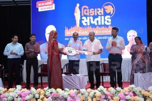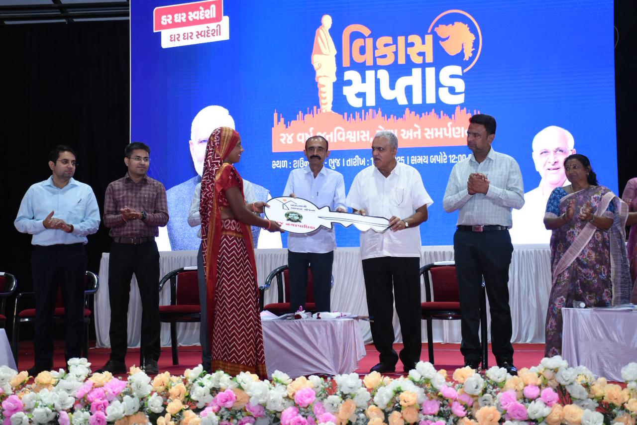 ભુજ,તા-૧૫ ઓક્ટોબર : વિકાસ સપ્તાહની ઉજવણીના અંતિમ દિવસે આજરોજ ભુજ ટાઉનહોલ ખાતે કચ્છ જિલ્લાના વિવિધ વિકાસકાર્યોના ઈ-લોકાર્પણ અને ઈ-ખાતમૂહુર્તનો કાર્યક્રમ જિલ્લા પંચાયત પ્રમુખશ્રી જનકસિંહ જાડેજાના અધ્યક્ષસ્થાને યોજાયો હતો. વિકાસ સપ્તાહ અંતર્ગત કચ્છ જિલ્લાના રૂ.૫૦.૭૮ કરોડના ૭૪૬ કામોનું ઈ-ખાતમૂહુર્ત અને રૂ.૨૬.૩૬ કરોડના ૩૧૨ વિકાસકામોનું ઈ-લોકાર્પણ કરવામાં આવ્યું હતું. કચ્છીમાડુઓને વિવિધ વિકાસકાર્યોની ભેટ આપતા જિલ્લા પંચાયતના પ્રમુખશ્રી જનકસિંહ જાડેજાએ હતું કે, ભૂકંપ બાદ વડાપ્રધાનશ્રીના વિઝનથી કચ્છ જિલ્લાએ ઔદ્યોગિક, પ્રવાસન, કૃષિ વગેરે ક્ષેત્રોમાં ઐતિહાસિક વિકાસ સાધ્યો છે. ભૂકંપ બાદ કચ્છમાં મા નર્મદાના નીરના અવતરણથી લઈને વિવિધ વિકાસકાર્યો અંગે વિગતવાર જાણકારી જિલ્લા પંચાયત પ્રમુખશ્રીએ આપી હતી. તેઓએ વધુમાં ઉમેર્યું હતું કે, વર્તમાન સમયમાં નાગરિકોને અનેક કલ્યાણકારી યોજનાઓનો લાભ સરકારશ્રી દ્વારા ઘર આંગણે જ મળી રહ્યો છે. જિલ્લા પંચાયત પ્રમુખશ્રીએ નાણાંપંચનો ઉલ્લેખ કરીને વિકાસમાં તમામ નાગરિકોને એકસરખા ભાગીદાર બનાવવાના સરકારશ્રીના આયોજનને મહત્વપૂર્ણ પગલું ગણાવ્યું હતું. તેઓએ રાષ્ટ્રના વિકાસ માટે તેમજ વિકસિત ભારત બનાવવાના સપનાને વિકસિત ગુજરાતથી સાકાર કરવા નાગરિકોને સહયોગ આપવા અપીલ કરી હતી. કચ્છ જિલ્લામાં રણોત્સવથી અનેક લોકોને રોજગારી મળી રહી છે તેમ જણાવીને આજરોજ લોકાર્પિત થયેલા વિવિધ વિકાસકામોથી નાનામાં નાના અને છેવાડાના લોકોના જીવનમાં પરિવર્તન આવશે તેમ તેઓએ વિશ્વાસ વ્યક્ત કર્યો હતો.પ્રાસંગિક પ્રવચન કરતા ભુજના ધારાસભ્યશ્રી કેશુભાઈ પટેલે જણાવ્યું હતું કે, ગુજરાતમાં વડાપ્રધાનશ્રીના વિઝનથી અને મુખ્યમંત્રીશ્રી ભૂપેન્દ્રભાઈ પટેલના માર્ગદર્શનથી વિવિધ માળખાકીય સુવિધાઓ જાહેરજનતા માટે ઉપલબ્ધ થઈ છે. કચ્છીમાડુઓની હિમ્મતથી અને સરકારના સહયોગથી કચ્છ જિલ્લો આજે અનેક ક્ષેત્રોમાં અગ્રેસર બન્યો છે. ટુરિઝમના વિકાસના લીધે કચ્છી કલાને પ્રોત્સાહન મળ્યું છે તેમજ સ્થાનિક લોકોને રોજગારી પ્રાપ્ત થઈ છે. રણોત્સવ જેવા આયોજનોથી કચ્છ જિલ્લામાં મોટું આર્થિક પરિવર્તન આવ્યું છે તેમ ધારાસભ્યશ્રીએ વધુમાં જણાવ્યું હતું.કચ્છ કલેક્ટરશ્રી આનંદ પટેલે વિકાસ સપ્તાહની ઉજવણી વિશે નાગરિકોને માહિતગાર કરતા જણાવ્યું હતું કે, ગુજરાતના તત્કાલિન મુખ્યમંત્રીશ્રી તરીકે શ્રી નરેન્દ્રભાઈ મોદીએ શરૂ કરેલા પ્રકલ્પો અને યોજનાઓ આજે રાષ્ટ્રીયસ્તરે સ્વીકૃત બની છે. ભૂકંપની આપદા બાદ વડાપ્રધાનશ્રીના વિઝનથી કચ્છ જિલ્લાના સરહદી વિસ્તારો અને શહેરોમાં થયેલા આયોજનપૂર્વકના વિકાસ અંગે કચ્છ કલેક્ટરશ્રીએ સૌને અવગત કરાવ્યા હતા. કલેક્ટરશ્રીએ વિકસિત ભારત ૨૦૪૭ના સ્વપ્નને સાક