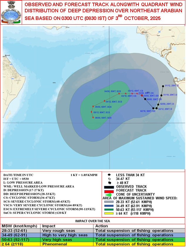 સાયક્લોનિક શક્તિની સ્થિતિમાં ભારે પવનને લઈને હવામાન વિભાગે માછીમારોને 3થી 6 ઑક્ટોબર સુધી દરિયો ન ખેડવા અને અરબ સાગરમાં ન જવા સખ્ત સૂચના આપવામાં આવી છે.