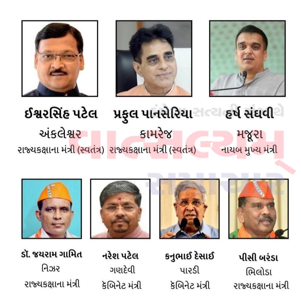 હર્ષ સંઘવી (ગૃહ, પોલીસ હાઉસિંગ, જેલ, બોર્ડર સિક્યુરિટી, ગ્રામ રક્ષક દળ, સિવિલ ડિફેન્સ, ટ્રાન્સપોર્ટ, કાયદો, સ્પોર્ટ્સ, MSMe વિભાગ, પ્રવાસન અને યાત્રાધામ, સિવિલ એવિએશન)
