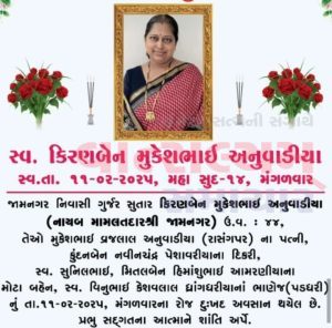 જામનગરની કલેક્ટર કચેરીના નાયબ મામલતદાર કિરણબેન મુકેશભાઇ અનુવાડીયાની અણધારી વિદાય એવા જ કઇક વજ્રાઘાત સમાન રહ્યાનું સદગતના નાના બહેન મીતલબેન (ચીફ એકાઉન્ટન્ટ GPO જામનગર) ડો. હિમાંશુભાઇ (GGGH JAMNAGAR) આમરણીયા એ જણાવી ઉમેર્યુ હતુ કે ભગવાન વિશ્ર્વકર્માજીની જયંતિના પાવન દિવસે કિરણબેનને તેઓની અજોડ સેવાઓ બદલ જ્ઞાતિરત્નથી સન્માનિત કરાયેલા ત્યારે અમોને ક્યાં ખબર હતી કે આ પાવન દિવસે જ કિરણબેન અનંતયાત્રાએ નીકળી જશે…..!!!!??