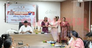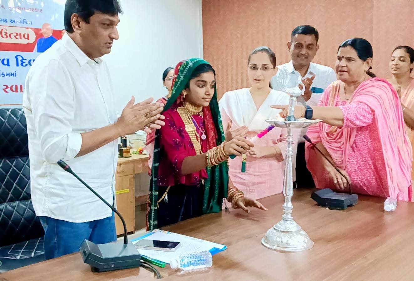 નારી વંદન ઉત્સવ અંતર્ગત મહિલા નેતૃત્વ દિવસની ઉજવણી જિલ્લા પંચાયત સભાખંડ ખાતે જિલ્લા પંચાયત પ્રમુખશ્રી હરેશભાઈ ઠુંમરની અધ્યક્ષતામાં કરવામાં આવી હતી. જેમાં નાયબ જિલ્લા વિકાસ અધિકારીશ્રી એમ.જે. સોમપુરા, જિલ્લા મહિલા અને બાળ અધિકારીશ્રી સી.જી.સોજીત્રા, પ્રોગ્રામ ઓફિસર વત્સલાબેન દવે, દહેજ પ્રતિબંધક સહરક્ષણ અધિકારીશ્રી બી.ડી.ભાડ ઉપસ્થિત રહયા હતા.આ પ્રસંગે પ્રમુખશ્રી હરેશભાઈ ઠુંમરે મહિલાઓ દરેક ક્ષેત્રમાં આગળ વધે, સ્વનિર્ભર બંને તેમજ નેતૃત્વ કરી દેશના વિકાસમાં ભાગીદાર બને તે માટે મહિલાઓને આહવાન કરવામાં આવ્યુ હતુ. જિલ્લા વિકાસ અધિકારીશ્રી મીરાબેન સોમપુરા દ્વારા મહિલાઓના નેતૃત્વના ગુણોને ઉજાગર કરવા મહિલાઓ જાતે જ મનોમંથન કરી આગળ વધે તે માટે મહિલાઓને દ્રષ્ટાંત સાથે પ્રોત્સાહિત કરવામાં આવ્યા હતા. કાર્યક્રમ દરમિયાન ગૌશાળા, ગાય આધારિત, ખેતી, શિક્ષણ, સંગીત ક્ષેત્રે આગવું નેતૃત્વ ધરાવતી મહિલાઓ અને કિશોરીઓનું સન્માન સાથે સાફલ્યગાથાઓ રજૂ કરવામાં આવી હતી