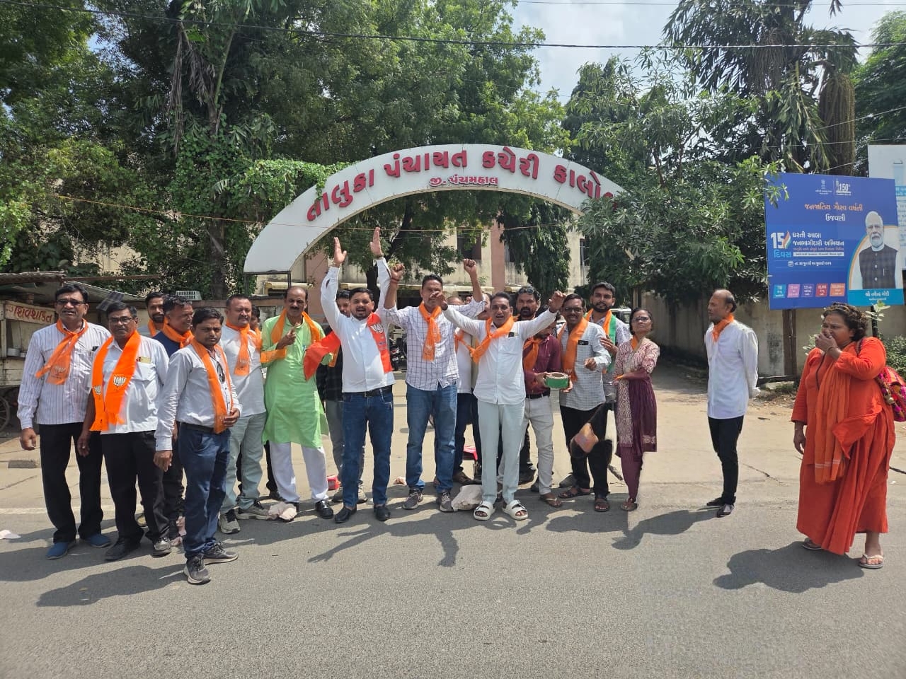 ગુજરાત પ્રદેશ ભાજપ પ્રમુખ તરીકે જગદીશભાઈ વિશ્વકર્મા ની નિમણુક કરવામાં આવતા કાલોલ તાલુકા પંચાયત કચેરી ખાતે કાલોલ તાલુકા ભાજપ અને શહેર ભાજપ સંગઠનના હોદ્દેદારો અને કાર્યકરોની ઉપસ્થિતિ વચ્ચે એક શાનદાર કાર્યક્રમનું આયોજન કરવામાં આવ્યો હતો આ કાર્યક્રમમાં કાલોલ શહેર ભાજપ મંડળના પ્રમુખ કલ્પેશભાઇ પારેખ‌,કાલોલ તાલુકા ભાજપ મંડળના મહામંત્રી વિરેન્દ્રસિંહ પરમાર,કાલોલ નગરપાલિકાના પ્રમુખ હસમુખભાઇ મકવાણા અને ઉપપ્રમુખ ગૌરાંગભાઈ દરજી સહિત કાલોલ તાલુકા સહિત શહેરના ભાજપ સંગઠનના હોદ્દેદારો અને કાર્યકર્તાઓમાં ગુજરાત પ્રદેશ ભાજપ પ્રમુખ તરીકે જગદીશભાઈ વિશ્વકર્મા ની નિમણુક ની જાહેરાત થતા કાર્યકરોમાં ભારે ઉત્સાહ જોવા મળ્યો હતો જ્યાં ફટાકડા ફોડી અને મીઠાઈ વહેંચીને પ્રદેશ ભાજપ પ્રમુખ ની નિમણુંકને લઇ ઉજવણી કરવામાં આવી હતી આ પ્રસંગે મોટી સંખ્યામાં કાર્યકરોએ ભારે સુત્રોચ્ચાર સાથે નારા લગાવી નિમણુંકને વધાવી લીધી હતી. પ્રદેશ ભાજપ પ્રમુખની નિમણૂંકના કાર્યક્રમે લઈ કાર્યકરોમાં નવી ઉર્જા ભરી અને કાલોલ તાલુકા અને શહેર ભાજપ મંડળના ભાજપ કાર્ય માટે નવી દિશામાં એક મજબૂત સંકલ્પ કર્યો હતો.