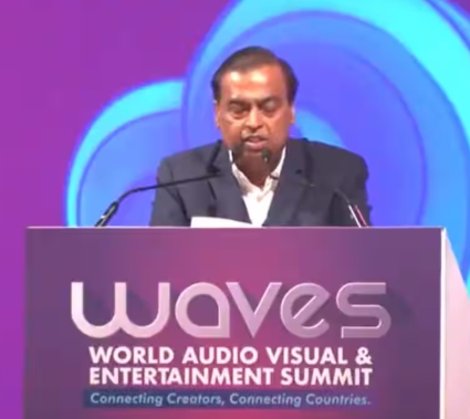 World Audio Visual and Entertainment Summit (WAVES) 2025 નું પ્રધાનમંત્રી શ્રી નરેન્દ્રભાઇ મોદીએ ઉદઘાટન કર્યુ તે સમિટમાં રીલાયન્સના ચેરમેન અને એમ.ડી.શ્રી મુકેશ અંબાણીનું વક્તવ્ય ખૂબજ ઉત્સાહ પ્રેરક અને શબ્દ વૈભવ સભર રહ્યુ હતુ