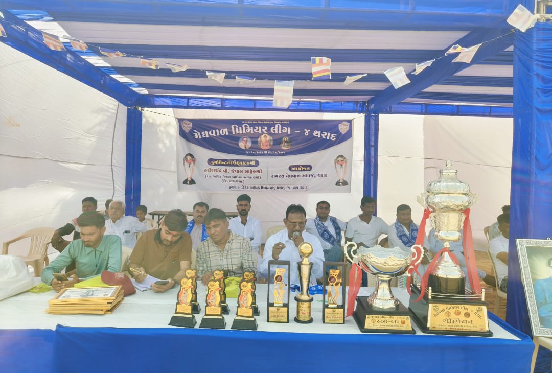 થરાદમાં મેઘવાળ સમાજ દ્વારા આયોજિત મેઘવાળ પ્રીમિયર લીગ (MPL) સીઝન-4 નો આજે ભવ્ય પ્રારંભ કરવામાં આવ્યો હતો. સવારે 8:30 વાગ્યે આ ક્રિકેટ ટૂર્નામેન્ટનું ઉદ્ઘાટનમા સમાજના મોટી પાવડ ડેરીના ચેરમેન અને મેઘવાળ સમાજનું ઘરેણું પથુભાઈ રાઠોડ દશરથભાઈ શ્રીમાળી મોહનભાઈ બોચિયા , મૂળજીભાઈ રાઠોડ,તેમજ મેઘવાળ સમાજના અન્ય અગ્રણીઓ અને આમંત્રિત મહેમાનોની ઉપસ્થિતિમાં કરવામાં આવ્યું હતું.