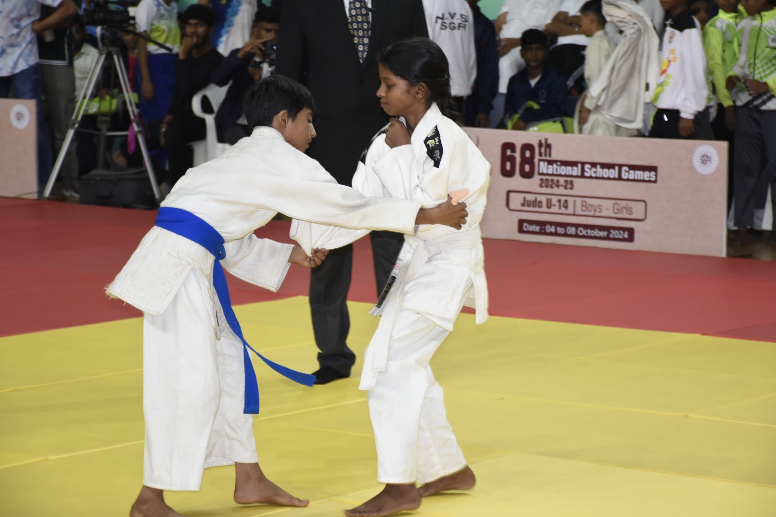 ગુજરાત સરકારના રમતગમત યુવા અને સાંસ્કૃતિક પ્રવૃત્તિઓ વિભાગ ગાંધીનગર અને સ્પોર્ટ્સ ઓથોરિટી ઓફ ગુજરાત સંચાલિત મહેસાણા જિલ્લા રમત પ્રશિક્ષણ કેન્દ્ર અને જિલ્લા રમતગમત અધિકારીની કચેરી દ્વારા ૬૮ મી સ્કૂલ ગેમ્સ ફેડરેશન ઓફ ઇન્ડીયા જુડો રમતના અંડર-૧૪ ભાઇઓ/બહેનોની રાષ્ટ્રકક્ષાની સ્પર્ધાનું તા.૦૪ થી ૦૮ ઓકટોબર-૨૦૨૪ સુધી આયોજન કરવામાં આવ્યું છે. આ જુડો સ્પર્ધાનો આજરોજ જિલ્લા પંચાયત પ્રમુખશ્રી તૃષાબેન પટેલ અને લોકસભાના સાંસદશ્રી હરિભાઈ પટેલની ઉપસ્થિતિમાં સરદાર પટેલ સ્પોર્ટ્સ કોમ્પલેક્ષ પાંચોટ, મહેસાણા ખાતે પ્રારંભ કરવામાં આવ્યો હતો.