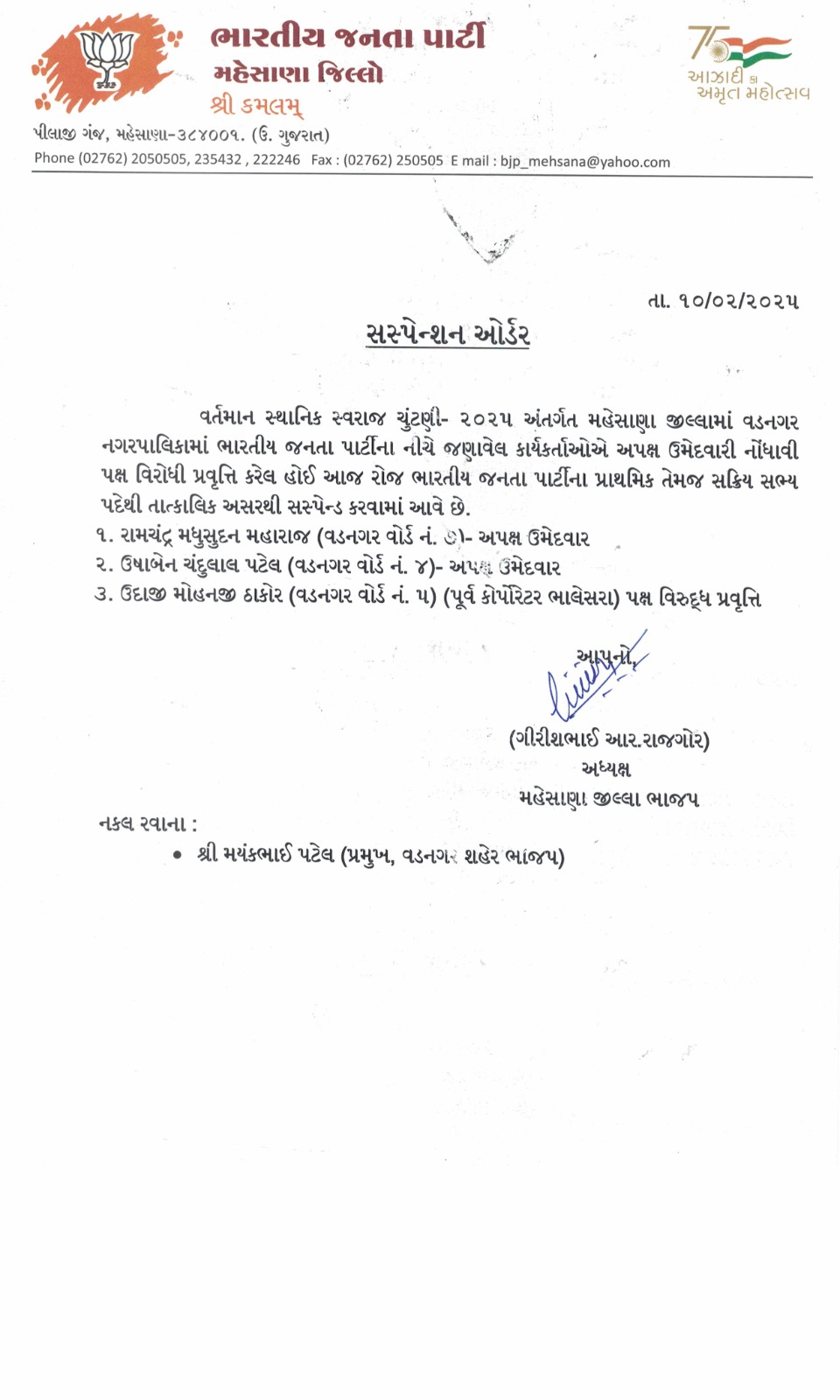 ભાજપ મેન્ડેડનો અનાદર કરી અપક્ષ ઉમેદવારી કરનાર ત્રણ સક્રિય સભ્ય સસ્પેન્ડ