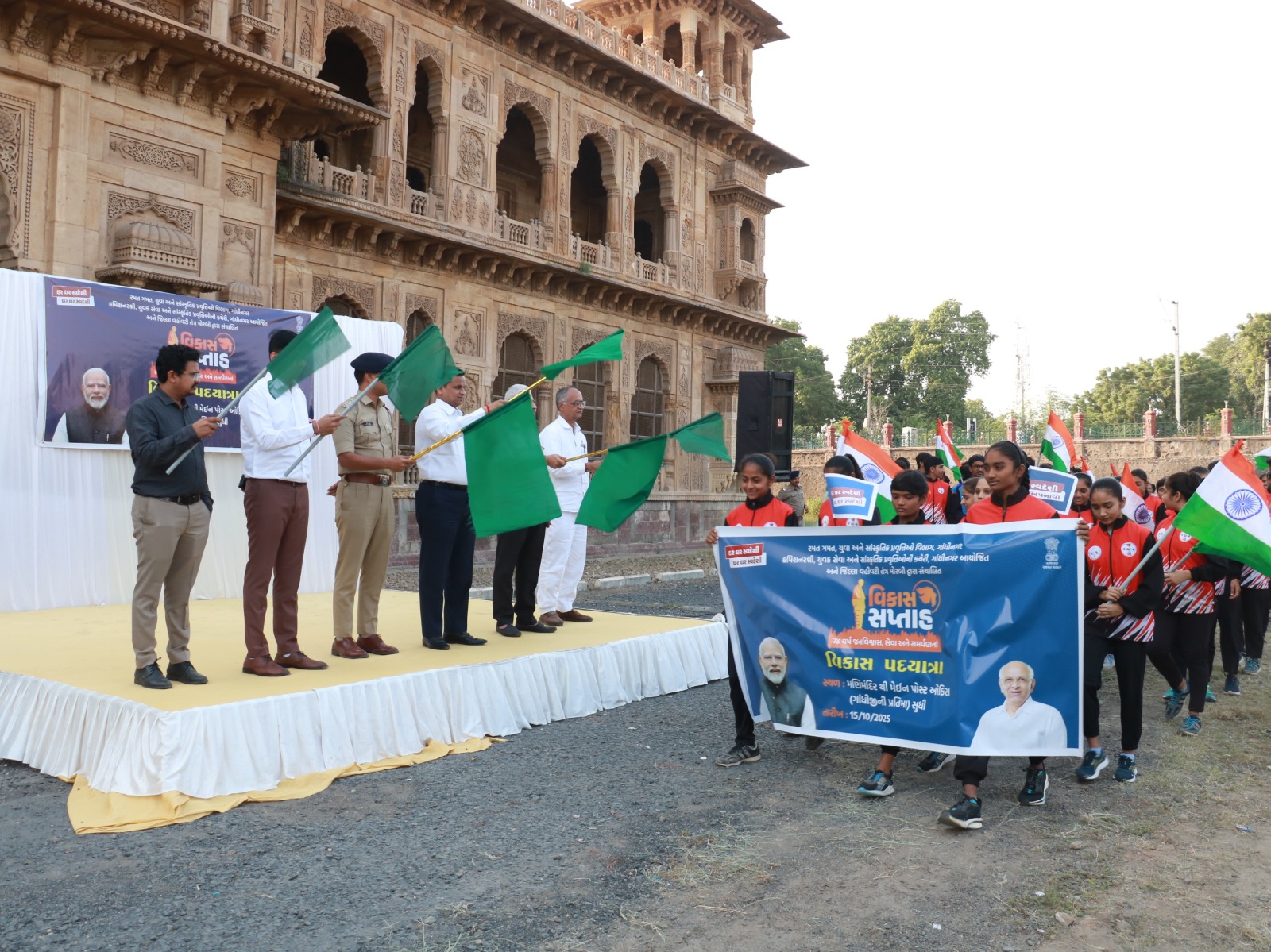 વિકાસ સપ્તાહની ઉજવણીના ભાગરૂપે યોજાયેલી આ વિકાસ પદયાત્રાને મહાનુભાવોએ લીલી જંડી બતાવી મણીમંદિર થી પ્રસ્થાન કરાવી હતી. ત્રિકોણ બાગ ખાતે ગાંધીજીના સુતરની આંટી પહેરાવી વિકાસ પદયાત્રાની પુર્ણાહુતિ કરવામાં આવી હતી. આ પ્રસંગે સર્વે ઉપસ્થિતોએ વિકાસ ભારત પ્રતિજ્ઞા લીધી હતી.
