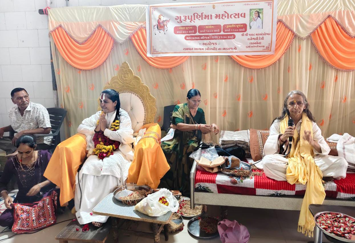 બલિહારી ગુરુદેવ કી જિસને ગુરુ દયો બતાઇ અષાઢ સુદ પૂનમ એટલે ગુરુ પુનમ આજે ગુરુપૂર્ણિમા નો દિવસ હોય ઠેર ઠેર ગુરુ પૂજન અને ગુરુ મહિમાના કાર્યક્રમો યોજાયા હતા. ગુરુ એટલે કુળ ગુરુ શિક્ષા ગુરુ જ્ઞાનગુરુ ટૂંકમાં જેમાંથી પ્રેરણા મળે તે ગુરુ એ આવું પ્રેરણા મળતું સ્થળ એટલે મોરબીના મહેન્દ્રનગર ગામ પાસે આવેલા રામધન આશ્રમ જ્યાં કાયમ જ્ઞાન ભક્તિની સરિતાઓ વહે છે આજના ગુરુપૂર્ણિમાના પાવન દિવસે રામધન આશ્રમમાં મહંત ભાવેશ્વરી દેવી માતાજી અને શ્રી શ્રી 1008 મહામંડલેશ્વર રત્નેશ્વરીદેવી ના સાનિધ્યમાં ગુરુ મહિમાનો સત્સંગ કાર્યક્રમ યોજાઈ રહ્યો છે. મોટી સંખ્યામાં આજે લોકો દર્શન કરવા આવી રહ્યા હતા અને દર્શન કરીને ભાવવિભોર બનતા હતા. અહીં ભોજન તો મળે છે પરંતુ મનની શાંતિ મળે તેવું કુદરતી વાતાવરણમાં આ આશ્રમ આવેલો છે.
