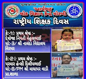 રાષ્ટ્રીય શિક્ષક દિવસ ‘5- સપ્ટેમ્બર વક્તૃત્વ સ્પર્ધા “આર્યભટ્ટ” લોક વિજ્ઞાન કેન્દ્ર, ધી વી. સી. ટેક. હાઈસ્કૂલ મોરબી ખાતે આયોજન કરેલ જેમાં મોરબીની જુદી જુદી શાળાઓનાં વિધાર્થીઓએ ભાગ લીધેલ જેમાં કેટેગરી – મુજબ આપેલ પ્રશ્ન માટે પ્રથમ શ્રેષ્ઠ રજુઆત કરનાર સ્પર્ધકોની યાદી જાહેર કરવામાં આવેલ છે.