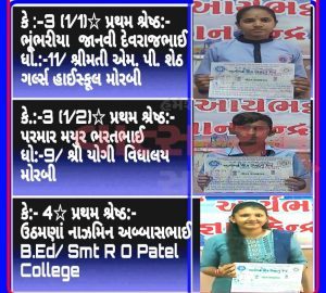 કેટેગરી:-3 ધો:-9, 10, 11, 12 Q:-3 ☆ “આધુનિક શિક્ષણ પદ્ધતિ માં ટેકનોલોજી શિક્ષણ ની જરૂરિયાત’ આપનાં વિચાર જણાવો પ્રથમ શ્રેષ્ઠ (1/1) :- ભૂંભરીયા જાનવી દેવરાજભાઈ ધો.:-11/ શ્રીમતી એમ. પી. શેઠ ગર્લ્સ હાઈસ્કૂલ મોરબી પ્રથમ શ્રેષ્ઠ (1/2):- પરમાર મયુર ભરતભાઈ ધો:-9/ યોગી વિધાલય મોરબી