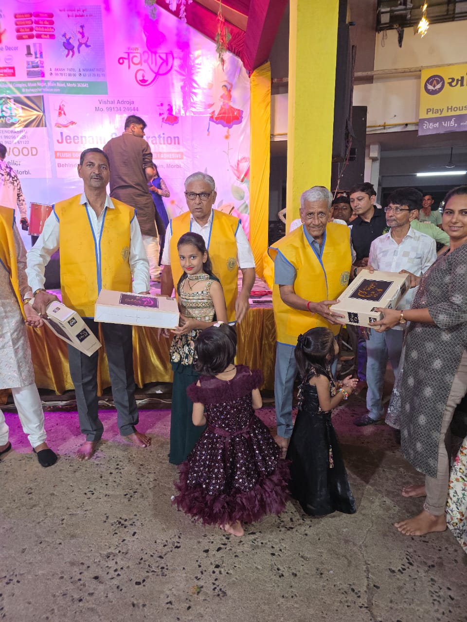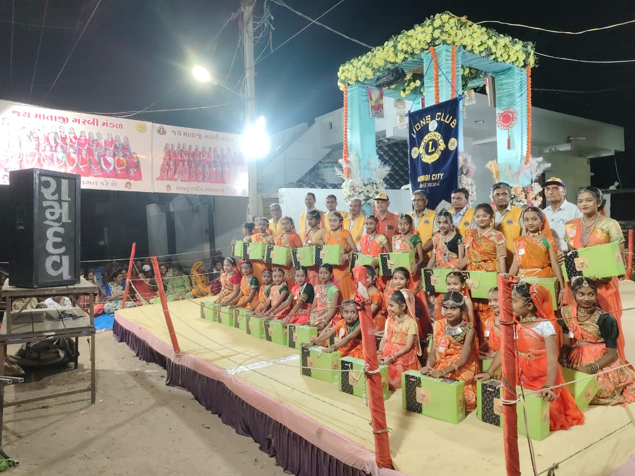 -કસ્ટભંજન હનુમાનજી મંદિર ગરબી મંડળ રણછોડનગર નવલખી રોડ મોરબી – કિશન પાર્ક ૧-૨-૩ અને નિત્યાનંદ ઉમિયા ગરબી મંડળ મોરબી – જય અંબે ગરબી મંડળ રાજપર( કુ) – સતનામ ગરબી મંડળ સતનામ નગર સોસાયટી ન્યુ ચંદ્રેશનગર મોરબી – શીતળા માતાજી ગરબી મંડળ માળિયા ( મિ) જેવી ગરબી મંડળની બાળાઓ ને હિન્દુ સંસ્કૃતિ ઉજાગર કરે અને તેઓને પ્રોત્સાહન મળે એ સબબ લાયન્સ કલબ ઓફ મોરબી સીટી ના મુખ્ય દાતાશ્રી લા હરખજીભાઈ ટી સુવારિયા ના હસ્તે લ્હાણી આપવામાં આવી તેમજ સહ દાતા લા મણીલાલ જે કાવર અને સૌરાષ્ટ્ર કચ્છના ફર્સ્ટ પાસ્ટ ડિસ્ટરિક ગવર્નર લા રમેશભાઈ રૂપાલાની પ્રેરક હાજરીમાં અને સેક્રેટરી અને ઝેડ સી લા કેશુભાઈ દેત્રોજા ખજાનચી લા ચંદુભાઈ કુંડારિયા પુર્વ પ્રમુખો લા ત્રિભોવન ભાઈ સી ફુલતરિયા લા ભીખાભાઈ એમ લોરિયા તેમજ લાયન સભ્યો લા મહાદેવભાઈ ચિખલિયા લા નાનજીભાઈ મોરડીયા લા ચેતનભાઈ રાબડીયા લા બાલુભાઈ પાંચોટીયા લા કિશોરભાઈ ધોરિયાણી લા રશ્મિકાબેન રૂપાલા લા ઉમેશભાઈ પાડલિયા ની ઉપસ્થિતિમાં અલગ અલગ ગરબી મંડળની બાળાઓ ને લ્હાણી આપવામાં આવી