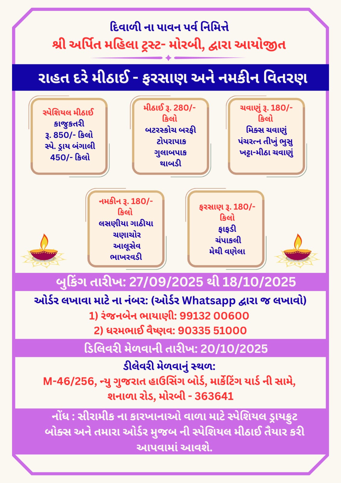 મોરબીની જાહેરા જનતા તેમજ ઉદ્યોગપતિ શ્રીઓ ને સહર્ષ નમસ્કાર. પારૂલ પ્રગતિ મહિલા મંડળ અને અર્પિત મહિલા ટ્રસ્ટ મોરબી તેમજ આરાધ્યા સખી મંડળ મારબી ના સંયુક્ત ઉપક્રમે દર વર્ષ ની માફક આ વર્ષે પણ દિવાળી ના શુભ અને પાવન પર્વ નિમિત્તે “મીઠાઈ-વિતરણ” નું આયોજન કરેલ છે. જે બજાર ભાવ કરતાં સસ્તુ પણ હશે અને ભરપૂર ગુણવત્તા વાળુ મળશે. આમ પણ આપ આપના પરિવાર માટે અથવા આપના વ્યવસાયિક સ્થાન પર કામ કરતા કર્મચારીઓ માટે દિવાળી પર્વમાં મીઠાઈ લઈ વિતરણ કરતા હોવ છો તો પછી ગમે ત્યાથી લેવા કરતા એવી જગ્યાએથી મીઠાઈ કેમ ન ખરીદીએ “જ્યાંથી મીઠાઈ ની સાથે વિશ્વાસ, ગુણવત્તા તેમજ સંસ્થા સાથે જોડાયેલ મહિલા વિકાસ અને મહિલા રોજગારી માટેના કામોને ટેકો કે મદદ કરવાનુ સીધે સીધુ પૂન્ય મળતુ હોય.” તો, આ સ્થળ છે અમારી સંસ્થા જેનુ એડ્રેસ નીચે મુજબ છે, તેમજ જે કંપની ને પોતાની બ્રાન્ડીગ કરવી હોય તો કરી આપશું તેમજ જો કોઈ સ્પેશિયલ મીઠાઈ બનાવી હશે તો બનાવી આપશું. તો આવો ઓર્ડર લખાવો અને દિવાળી પર મીઠુ મોઢુ કરો અને કરાવો.
