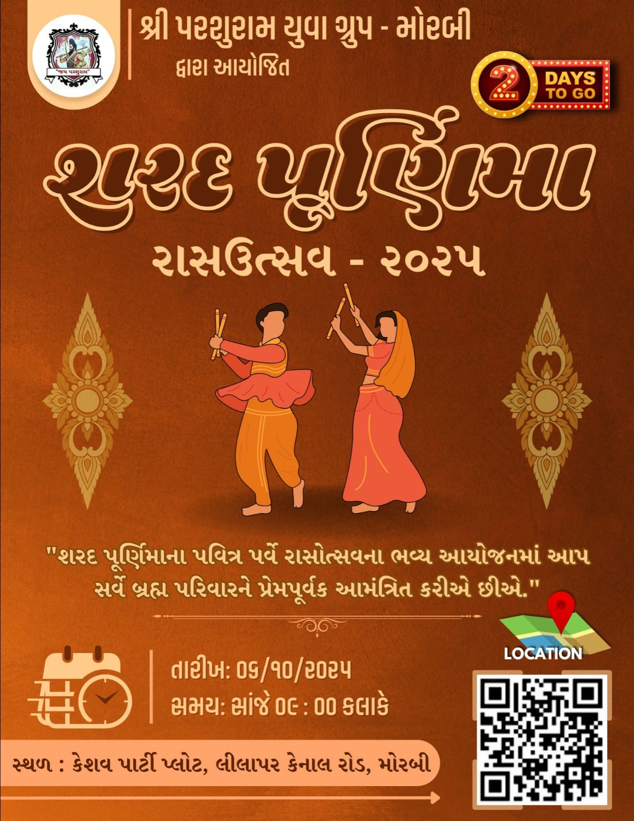 શ્રી પરશુરામ યુવા ગૃપ-મોરબી દ્વારા આયોજીત શરદપૂર્ણિમા નિમિત્તે ભવ્ય રાસોત્સવનું આયોજન કરવામાં આવે છે. તે અનુસંધાને આ વર્ષે પણ શરદોત્સવનું ભવ્ય આયોજન કરવામાં આવેલ છે.