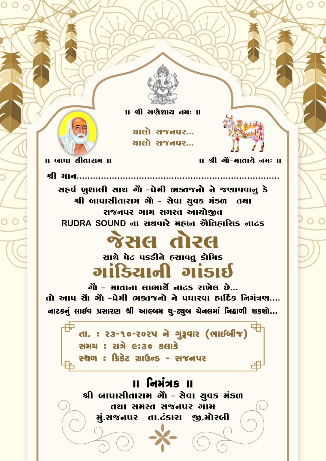 ટંકારા તાલુકાના સજનપર ગામે તા.૨૩/૧૦/૨૫ ને ગુરુવાર (ભાઈબીજ)ના રોજ બાપા સીતારામ ગૌ સેવા યુવક મંડળ તથા સમસ્ત સજનપર ગામ દ્વારા આયોજિત ગૌશાળા ના લાભાર્થે મહાન ઐતિહાસિક નાટક જેસલ તોરલ અને હાસ્ય રસિક કોમિક ગાંડિયાની ગાંડાઈ રાત્રે ૯:૩૦ કલાકે રાખેલ છે તો દરેક ધર્મ પ્રેમી ગૌ પ્રેમી જહેર જનતાને નાટકમા પધારવા બાપા સીતારામ ગૌ સેવા યુવક મંડળ તથા સમસ્ત સજનપર ગામ વતી હાર્દિક આમન્ત્રણ છે