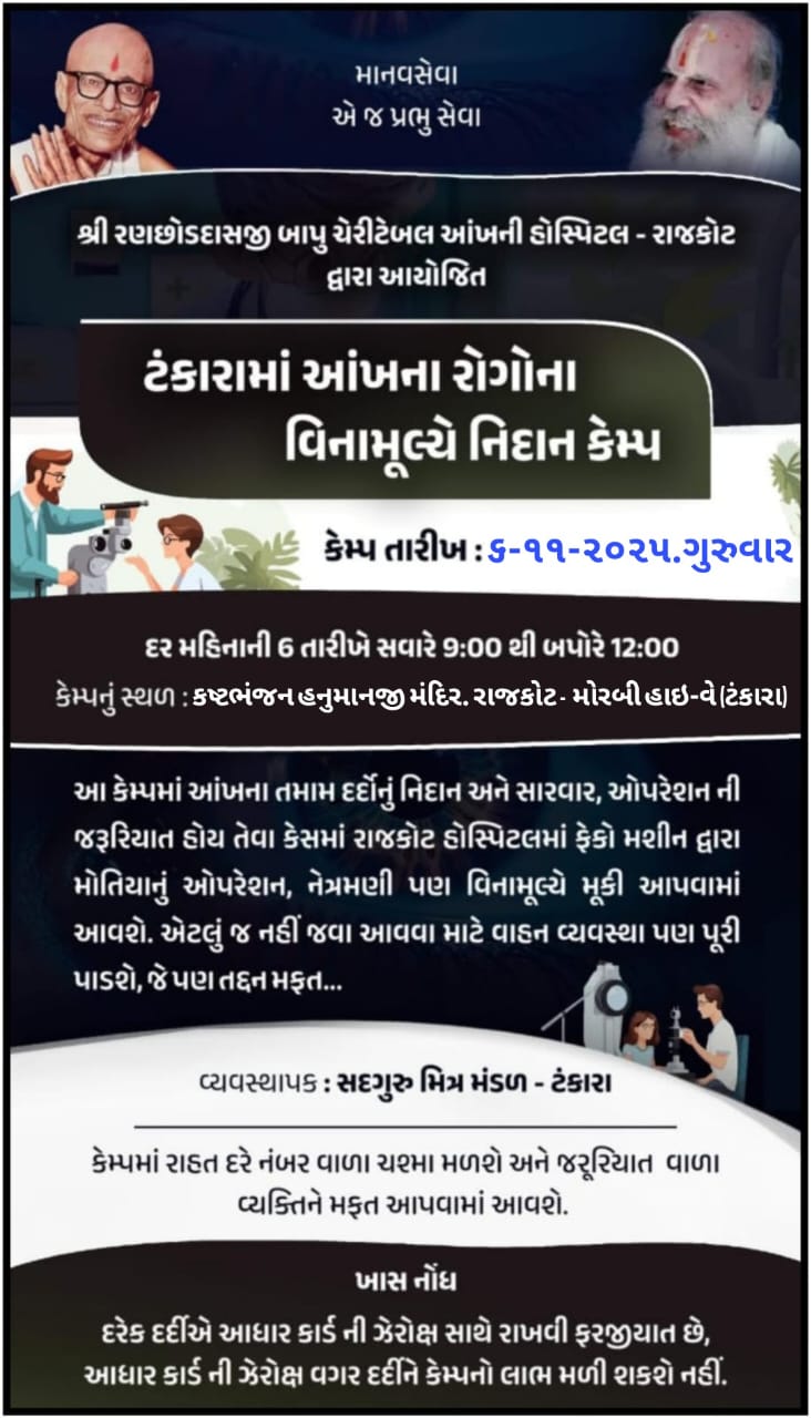 શ્રી રણછોડદાસજી બાપુ ચેરીટેબલ આંખની હોસ્પિટલ – રાજકોટ દ્વારા “માનવસેવા એ જ પ્રભુસેવા”ના સિદ્ધાંતને અનુસરીને ટંકારામાં આંખના રોગોના વિનામૂલ્યે નિદાન કેમ્પનું આયોજન કરવામાં આવ્યું છે. આ કેમ્પ દર મહિનાની ૬ તારીખે યોજાઈ છે , જે ૬ નવેમ્બર, ૨૦૨૫ (ગુરુવાર)ના રોજ સવારે ૯:૦૦ વાગ્યાથી બપોરે ૧૨:૦૦ વાગ્યા સુધી ચાલશે. કેમ્પનું સ્થળ હવેથી કષ્ટભંજન હનુમાનજી મંદિર, રાજકોટ-મોરબી હાઇવે (ટંકારા) રહેશે. આ કેમ્પમાં આંખના તમામ પ્રકારના રોગોનું નિદાન અને સારવાર વિનામૂલ્યે કરવામાં આવશે. જો દર્દીને મોતિયાનું ઓપરેશનની જરૂર પડે, તો તેમને રાજકોટની હોસ્પિટલમાં ફેકો મશીન દ્વારા ઓપરેશન કરાવવામાં આવશે અને નેત્રમણી પણ મફતમાં મૂકી આપવામાં આવશે. વધુમાં, દર્દીઓને જવા-આવવા માટે વાહન વ્યવસ્થા પણ તદ્દન મફત પૂરી પાડવામાં આવશે.આ કેમ્પનું વ્યવસ્થાપન સદગુરુ મિત્ર મંડળ – ટંકારા દ્વારા કરવામાં આવી રહ્યું છે.