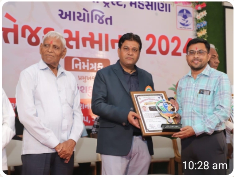 શ્રી વેદ ઈન્ટરનેશનલ સ્કૂલ, ગાંધીનગર ખાતે 11 ઓગસ્ટ 24 ના મહેસાણા, સાબરકાંઠા, ગાંધીનગર, બનાસકાંઠા, પાટણ, અરવલ્લી અને કચ્છ જિલ્લાના શિક્ષક મિત્રો જેમણે શિક્ષણ ક્ષેત્રે પોતાનું વિશેષ યોગદાન આપીને તાલુકા કક્ષા, જિલ્લા કક્ષા, રાજયકક્ષા તેમજ રાષ્ટ્રકક્ષા સુધી એવોર્ડ મેળવેલ છે તેવા શ્રેષ્ઠ સારસ્વતો માટે વિદ્યોતેજક સન્માન કાર્યક્રમ શ્રી બ્રહ્મ સમાજ સેવા ટ્રસ્ટ, મહેસાણાના સહયોગથી અને ગુજરાત રાજ્ય માધ્યમિક શિક્ષણ બોર્ડના મદદનીશ સચિવશ્રી પુલકિતભાઈ જોશીની પ્રેરણાથી યોજાયો. ગુજરાતના ઈતિહાસમાં પ્રથમવાર છે. આ કાર્યક્રમમાં ડૉ. સી.જે.ચાવડા સાહેબશ્રી-ધારાસભ્ય વિજાપુર, રીટાબેન પટેલ – ધારાસભ્ય ગાંધીનગર, ડૉ. સુખાજી ઠાકોર – ધારાસભ્ય બેચરાજી, મનુભાઈ ચોકસી – પૂર્વ ચેરમેન જિલ્લા શિક્ષણ સમિતિ,મહેસાણા, એમ.પી. મહેતા, સચિવશ્રી સર્વ શિક્ષા અભિયાન, શ્રી એમ.કે રાવલ નિયામકશ્રી GSEB અને GIET ગાંધીનગર, શ્રી વેદ ઈન્ટરનેશનલ સ્કૂલના સંચાલકશ્રી ધર્મેશભાઈ પટેલ વગેરેએ શ્રેષ્ઠ શિક્ષકોને સન્માન પત્ર આપ્યાં ઉલ્લેખનીય છે કે આ અગાઉ પણ પરેશભાઈને સરકારશ્રી દ્વારા શ્રેષ્ઠ શિક્ષક એવોર્ડ,પ્રતિભાશાળી શિક્ષક સન્માન,પ્રકૃતિ મિત્ર એવોર્ડ,રોટરી કલબ દ્વારા પણ સન્માન પ્રાપ્ત થયા છે.જેઓ તમામ એવોર્ડ પોતાના વિધાર્થીઓ ને સમર્પિત કરે છે.