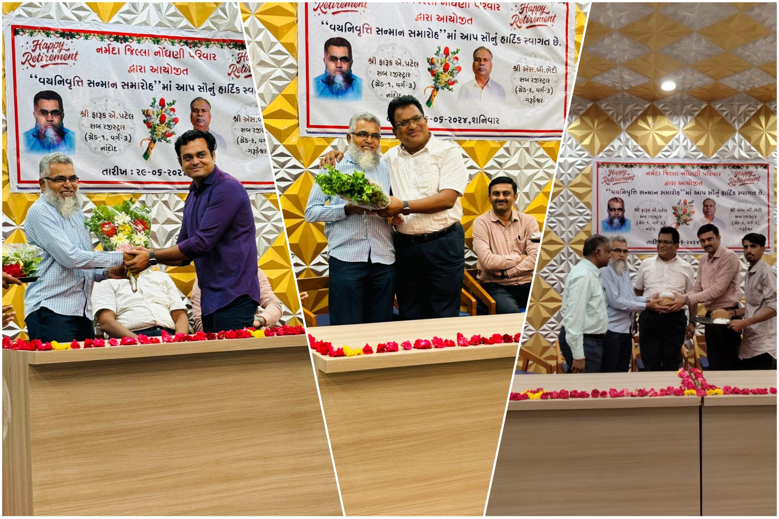 નર્મદા જિલ્લામાં સબ રજિસ્ટ્રાર તરીકે ફરજ બજાવતા ફારુક પટેલ તેમજ એસ.બી.ભેદી વય નિવૃત્ત થતાં વિદાય સમારંભ યોજાયો