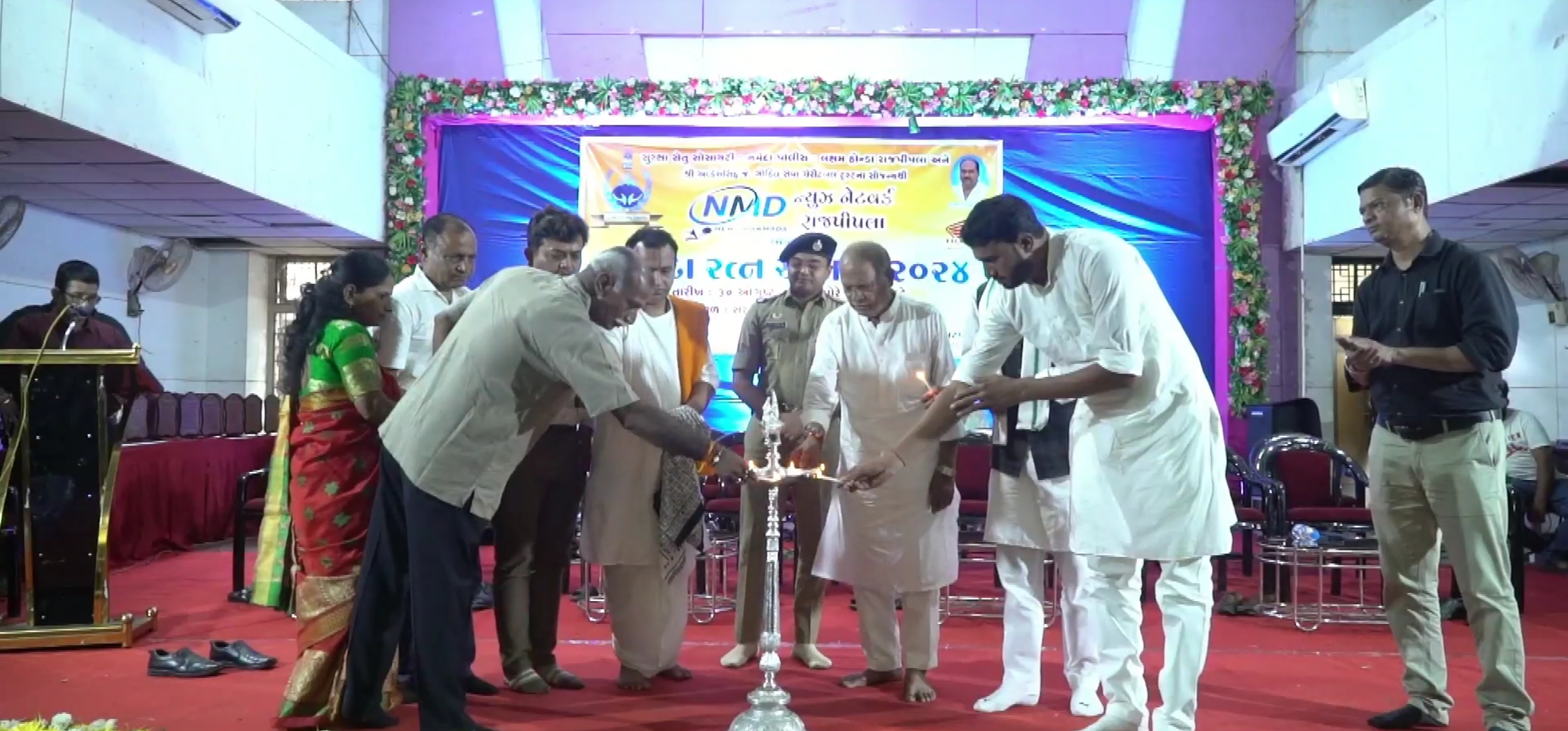 સુરક્ષા સેતુ સોસાયટી, નર્મદા પોલીસલક્ષમ હોન્ડા રાજપીપળા, સ્વ.અલ્કેશસિંહ જે.ગોહિલ સેવા ચેરીટેબલ ટ્રસ્ટના ઉપક્રમે NMD ના આયોજકો દ્વારા આયોજિત રાજપીપલા સરદાર ટાઉનહોલમાં નર્મદા જિલ્લામાં વિશિષ્ટ કામગીરી કરનાર અધિકારીઓ કર્મચારીઓ,વિવિધ સંસ્થાઓ તેમજ વ્યક્તિગત રીતે વિશિષ્ટ સમાજ ઉપયોગી કામગીરી કરનાર નર્મદા જીલ્લામાં વિવિધ ક્ષેત્રોમાં ઉત્કૃષ્ટ કામગીરી કરનાર અને જિલ્લાનું ગૌરવ વધારી અન્યને પ્રેરણા આપનાર શ્રેષ્ઠિઓનો સન્માન સમારંભ રાખવામાં આવ્યો હતો.જેમાં 80 જેટલા શ્રેષ્ઠિઓ ને નર્મદા રત્ન એવોર્ડ 2024 એનાયત, શાલ ઓઢાડી, પુષ્પ ગુચ્છ એનાયત કરી સન્માનિત કર્યા હતા.આ કાર્યક્રમમાં ઉપસ્થિત સાંસદ મનસુખભાઈ વસાવા, જિલ્લા પોલીસ વડા પ્રશાંત સુમ્બે,ધારાસભ્ય ચૈતર વસાવા, પૂ.જયદેવ શાસ્ત્રીજી,ની ઉપસ્થિતી માં NMD ચેનલ પરિવાર દ્વારા સન્માન કરવામાં આવ્યું સાંસદ મનસુખ વસાવા એ નર્મદા જિલ્લા માં શિક્ષણ વધુ ઉપરલાવની વાત કરી જ્યારે ડેડીયાપાડા ના ધારાસભ્ય ચૈતર વસાવા એ નર્મદા એવોર્ડ થી જે લોકો સન્માનિત થયા એમને ભારત રત્ન સુધી પહોંચે એવા અભિનંદન આપ્યા