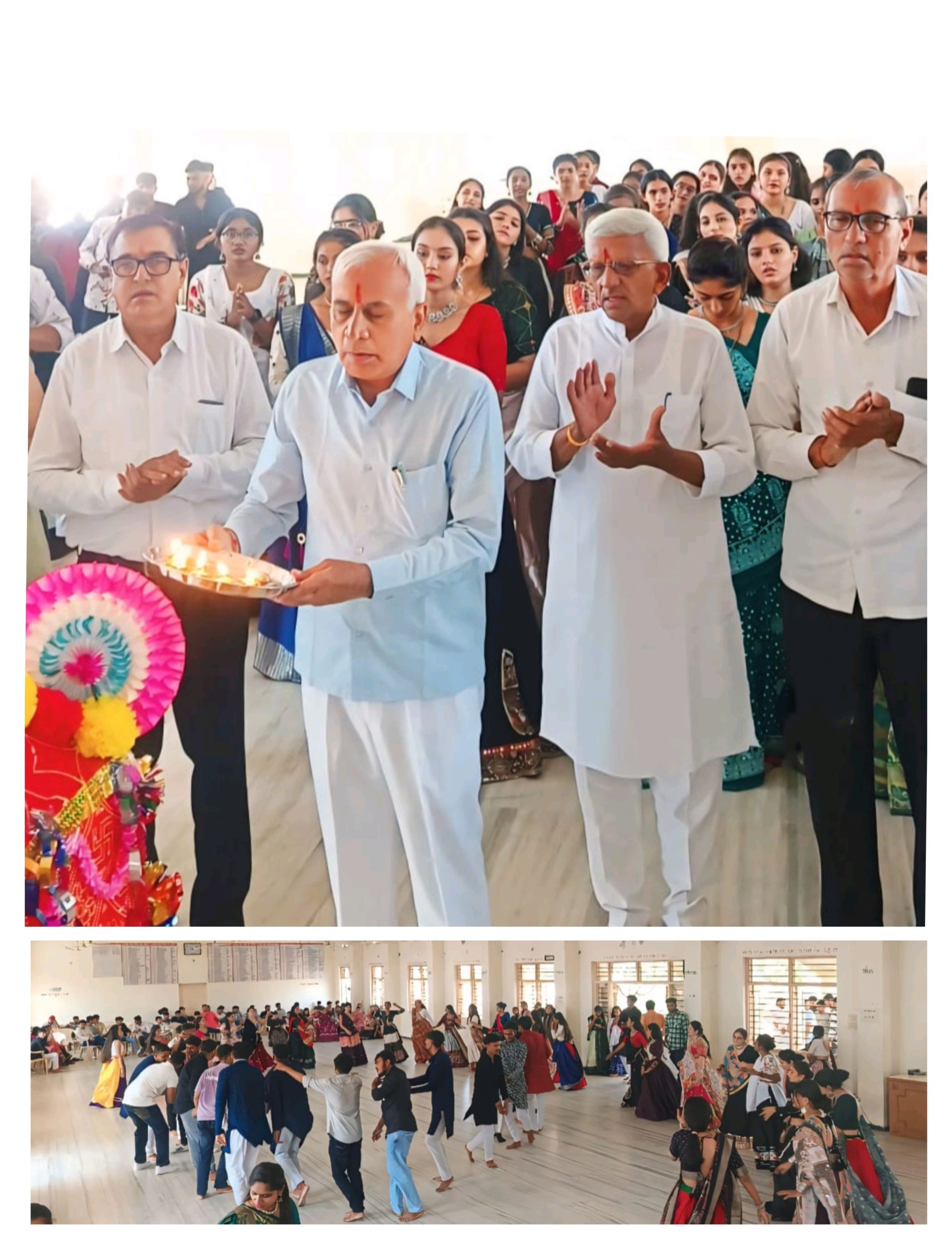 શ્રી અખિલ આંજણા કેળવણી મંડળ સંચાલિત આદર્શ સાયન્સ,આર્ટ્સ એન્ડ કોમર્સ કોલેજ, વિસનગર ખાતે તારીખ-7 ઓકટોબર 24 ના રોજ નવરાત્રિ મહોત્સવની ઉજવણી કરવામાં આવી. જેમાં કેળવણી મંડળના પ્રમુખશ્રી કે.કે.ચૌધરી, મંત્રીશ્રી વી.વી.ચૌધરી, મંત્રીશ્રી જે.ડી.ચૌધરી તથા છાત્રાલય સમિતિના પ્રમુખશ્રી આઈ.બી.ચૌધરી વગેરે તથા તમામ વિભાગના આચાર્યશ્રીઓ, સ્ટાફ મિત્રો અને કોલેજના વિદ્યાર્થીઓ નવરાત્રી મહોત્સવમાં ઉપસ્થિત રહ્યા હતા.આ પ્રસંગે કેળવણી મંડળના પ્રમુખશ્રી, હોદ્દેદારશ્રીઓ તથા આચાર્યશ્રીઓએ અને સ્ટાફ મિત્રોએ મા અંબાની શ્રદ્ધાપૂર્વક આરતી ઉતારી વિદ્યાર્થીઓના ઉજ્જવળ ભવિષ્ય માટે આશીર્વાદ માગ્યા હતા. વિદ્યાર્થીઓએ પણ ટ્રેડિશનલ ડ્રેસમાં હર્ષ-ઉલ્લાસ સાથે ગરબે ઘૂમી માતાજીની આરાધના કરી હતી. આ સાથે લકી ડ્રોનું આયોજન કરી વિદ્યાર્થીઓને ઈનામ વિતરણ પણ કરાયું હતું. આમ કેળવણી મંડળના પ્રમુખશ્રી તથા હોદ્દેદારશ્રીઓની પ્રેરણાથી તથા કોલેજના આચાર્યશ્રીના માર્ગદર્શન નીચે તમામ સ્ટાફ મિત્રોના સહયોગથી નવરાત્રિ પર્વનું સુંદર આયોજન કરાયું હતું. છેલ્લે સૌ અલ્પાહાર લઈ છૂટા પડ્યા હતા.