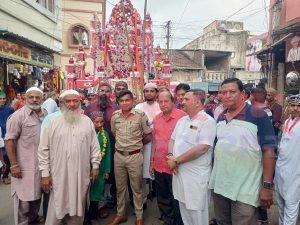 ઇસ્લામ ધર્મ માટે કરબલાના મેદાનમાં શહિદ થયેલા હઝરત ઇમામ હુસેન અને 72 સાથીઓની યાદમાં મુસ્લિમો મહોરમ પર્વ મનાવે છે.બુધવારે મહોરમના પર્વ નિમિત્તે ખેરગામ મુસ્લિમ મહોલ્લાથી ભવ્ય તાજીયા ઝુલુસ શરૂ કરી બજાર પોસ્ટ ઓફિસ થઈ મસ્જિદે થઈ ઔરંગા નદી ખાતે ટાઢા કરવા માટેની વિસર્જન યાત્રા શાંતિપૂર્ણ રીતે સંપન્ન થઈ હતી.જેમાં હિન્દૂ સમાજના આગેવાનો અનિલભાઈ કાપડિયા,તાલુકા પંચાયત પ્રમુખ રાજુભાઇ પટેલ,ન્યાય સમિતિ અધ્યક્ષ પૂર્વેશભાઈ ખાંડાવાલા સહિતના આગેવાનો દ્વારા માજી મુતુવલી ઝમીરભાઈ શેખ,તાજીયા કમિટીના પ્રમુખ શોએબભાઈ શેખ,ફારૂકભાઈ શેખ,મુતવલ્લી ગુલામભાઈ શેખ સહિતના આગેવાનોનું ફુલહારથી સ્વાગત કરવામાં આવ્યું હતું.જ્યારે આગલી રાત્રે પણ તાજીયાનું ઝુલુસ નીકળ્યું હતું.બુધવારે બપોરે મોહરમના કલાત્મક તાજીયાનુ ઝુલુસ દરમ્યાન કોઈ અનિચ્છનીય બનાવ ન બને તે માટે ખેરગામના પીએસઆઇ એમબી ગામીત અને તેમના પોલીસ સ્ટાફ, હોમગાર્ડઝ ગ્રામ રક્ષક દળ વિગેરેએ સુલેહ શાંતિ જાળવવા ખડે પગે સેવા આપી હતી.
