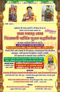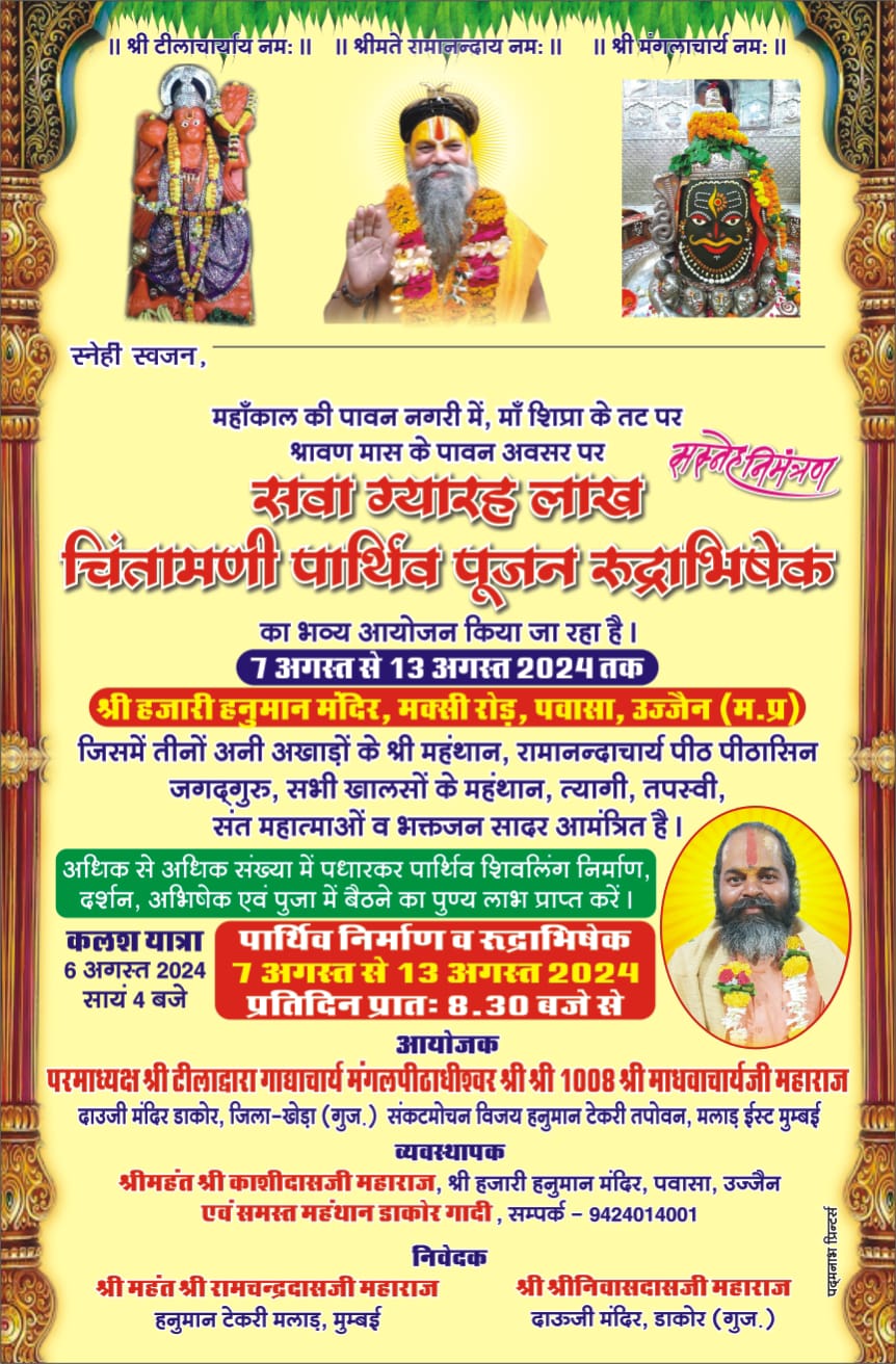 દાહોદ પ્રવિત્ર શ્રાવણ માસ મા પરમાધ્યક્ષ શ્રી ટીલા દ્વારા ગાધાચાયૅ મંગલપીઠાધીશ્ચર શ્રી.શ્રી ૧૦૦૮ શ્રી માધવાચાયૅજી મહારાજ દ્વારા મધ્ય પ્રદેશના ઉજજૈન ખાતે આવેલ શ્રી હજારી હનુમાનજી મંદિર મકસી રોડ પવાસા મુકામેવિશ્ર્વ શાંતિ તથા માનવ કલ્યાણ માટે સવા અગયાર લાખ ચિંતા મણી પાથિવ પૂજન રુદ્વાભિષેક મહાયજ્ઞ નુ વિશાળઆયોજન કરવામાં આવ્યું છે આ અંગેની વિસ્તૃત માહિતી આપતા રામજી મંદિર દાહોદ અને રામાનંદ પાકૅ ના મહામંડલેશ્વર જગદીશદાસજી મહારાજ એ જણાવ્યું કે તારીખ ૦૭ મી ઓગસ્ટ.૨૦૨૪ થી ચાલનારા આ કાયૅક્રમ ની તારીખ ૧૩ મી ઓગસ્ટ ના રોજ પૂણૉહૂતિ કરવામાં આવશે આ કાયૅક્રમ મા સમગ્ર ભારતમાંથી વિવિધ અખાડા ના મંહતો.સાધુ સંતો.તમામ ખાલસા ઓ ના મંહતો ત્યાગી. તપસ્વીઓ સંતો મહાત્માઓ ઉપસ્થિત રહેનાર છે આ તારીખ દરમિયાન વિવિધ ધાર્મિક કાયૅક્રમો પણ થનાર છે ભક્ત શ્રધ્ધાળુઓ ને આ કાયૅક્રમ મા વધુ ને વધુ વ્યક્તિ ઓ લાભ લે તે માટે ની અપીલ કરવામાં આવી છે