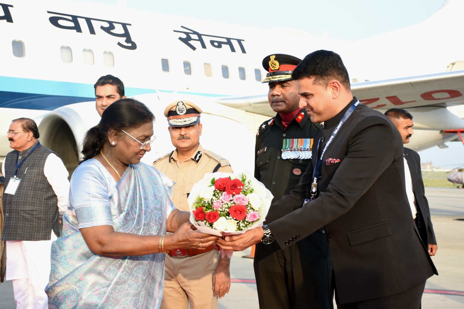 માન. રાષ્ટ્રપતિશ્રી દ્રૌપદી મુર્મુને રાજકોટ એરપોર્ટ ખાતે પ્રવાસન મંત્રીશ્રી મુળુભાઇ બેરા, મેયરશ્રી નયનાબેન પેઢડીયા, સંસદસભ્યો સર્વશ્રી રામભાઇ મોકરીયા અને શ્રી કેસરીદેવસિંહજી ઝાલા, શહેર પોલિસ કમિશ્નર શ્રી બ્રજેશકુમાર ઝા, એન.સી.સી.રાજકોટના કમાન્ડન્ટ બ્રિગેડીયર લોગનાથન તથા કલેકટર ડો.ઓમ પ્રકાશે પુષ્પગુચ્છ આપીને આવકાર્યા હતા.