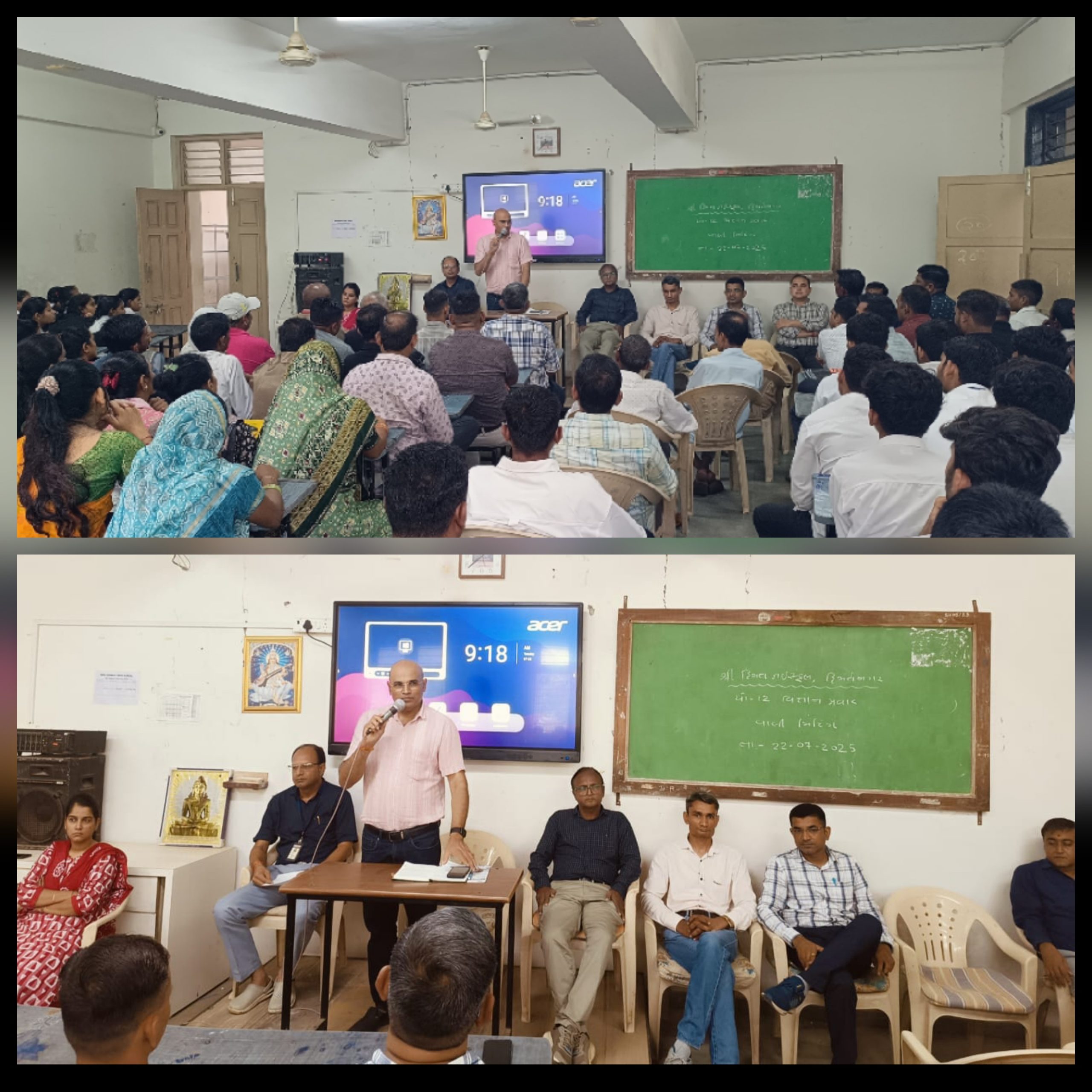 આજરોજ શાળામાં અભ્યાસ કરતા ધોરણ 12 વિજ્ઞાન પ્રવાહના વિદ્યાર્થીઓ અને વાલીઓની મીટીંગ યોજવામાં આવી. જેમાં મોટી સંખ્યામાં વાલીઓ હાજર રહ્યા. કાર્યક્રમની શરૂઆત પ્રાર્થના અને સ્વાગત પ્રવચનથી કરવામાં આવી. શાળાના વિજ્ઞાન પ્રવાહના કેમેસ્ટ્રી ટીચર શ્રી ચિરાગભાઈ પટેલ એ વિદ્યાર્થીઓને ઉપયોગી સુંદર માહિતી આપી. આચાર્યશ્રી સુરેશભાઈ પટેલે વિદ્યાર્થીઓને ભાવિ કારકિર્દી, ટાઈમ મેનેજમેન્ટ, હેલ્થ, પરીક્ષાલક્ષી માહિતી તથા વાલીઓ માટે પણ ઉપયોગી પ્રવચન આપ્યું અને વિદ્યાર્થીઓને વાલીઓને વધારે સારા માર્ક મેળવવા માર્ગદર્શન કર્યું. વાલીઓ ખૂબ ઉત્સાહી જોવા મળ્યા. વાલીઓએ પણ કેટલાક સૂચન કર્યા. સમગ્ર કાર્યક્રમનું સંચાલન તથા આભાર વિધિ સુપરવાઇઝર અને સીનીયર શિક્ષક શ્રી પી.જે.મહેતાએ કરી. શાળાના વિજ્ઞાન પ્રવાહના તમામ શિક્ષક મિત્રો હાજર રહ્યા.