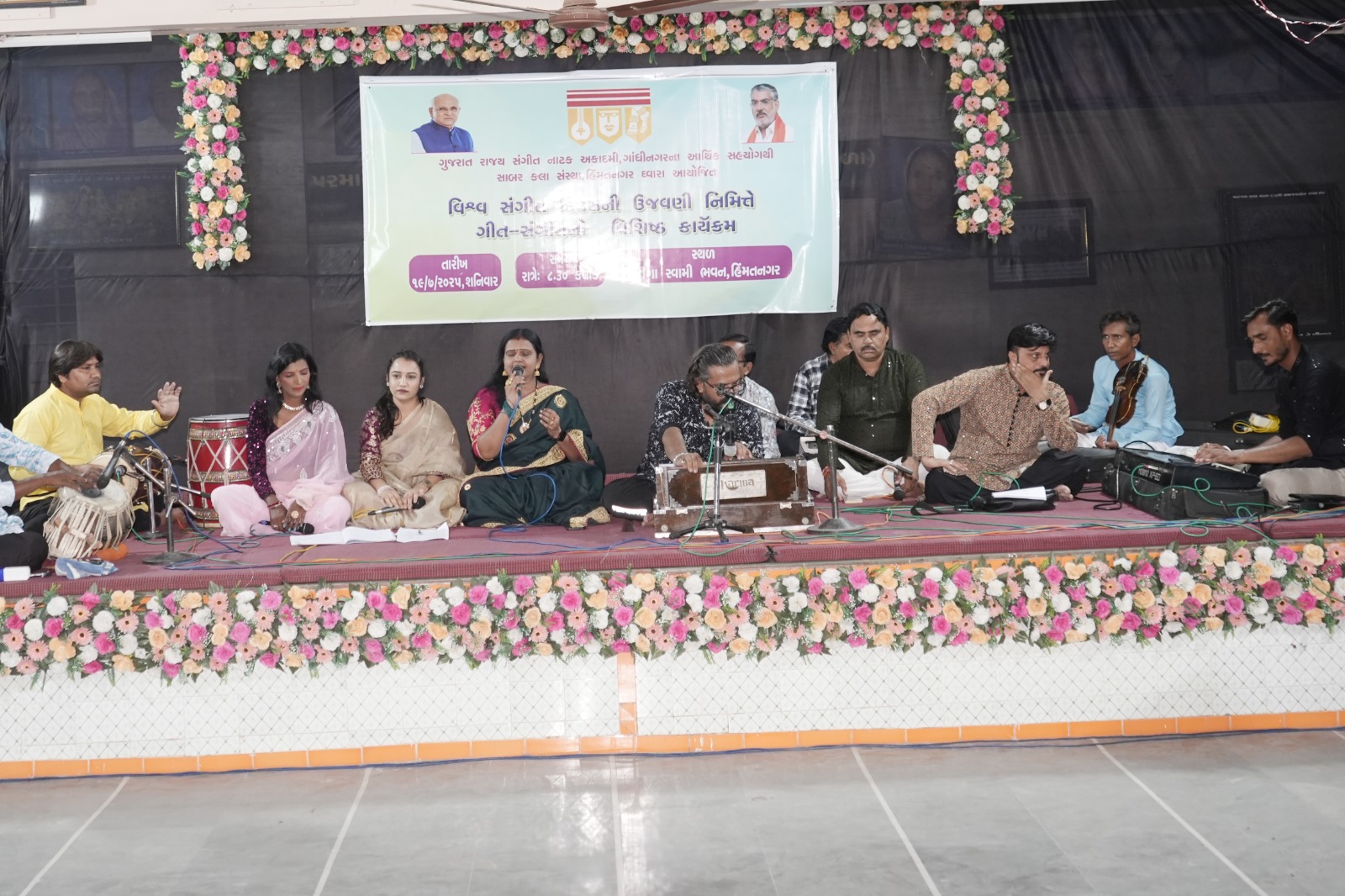 ગુજરાત રાજ્ય સંગીત નાટક અકાદમી ગાંધીનગરના આર્થિક સહયોગથી અને સાબર કલા સંસ્થા હિંમતનગર દ્વારા વિશ્વ સંગીત દિવસ નિમિત્તે તારીખ ૧૯/૭/૨૫ ના રોજ હિંમતનગર ખાતે ગીત સંગીતનો કાર્યક્રમ યોજાયો. અંગે આ પ્રસંગે સમારંભ અધ્યક્ષ સ્થાને હિંમતનગર તાલુકાના ધારાસભ્ય વી.ડી.ઝાલા ઉપસ્થિત રહ્યા હતા સાથે હિંમતનગર નગરપાલિકાના ઉપપ્રમુખ સવજીભાઈ ભાટી, સ્કાઉટ ગાઈડ સંઘ ના ચીફ કમિશનર અતુલભાઇ દીક્ષિત, જાયન્ટ્સ ગ્રુપ હિંમતનગરના પ્રમુખ પી.જી. મહેતા, જાયન્ટ્સ સહિયર ગ્રુપ ના પ્રમુખ સોનલબેન મહેતા, હિંમતનગર શહેર ભાજપના મહામંત્રી પ્રકાશભાઈ વૈદ મહેમાન સ્થાને ઉપસ્થિત રહ્યા. તમામ મહેમાનોનું બુકે અને મોમેન્ટ આપી સાબર કલા સંસ્થા દ્વારા સન્માન કરવામાં આવ્યું હતું. પોતાના પ્રસંગિક વક્તવ્યમાં ધારાસભ્ય વી.ડી. ઝાલાએ શહેરમાં યોજાતી સંગીતની આ પ્રવૃત્તિને ખૂબ બિરદાવી હતી અને સરકારના કલાકારોને પ્રોત્સાહિત કરવાના પ્રયાસને વખાણ્યો હતો. આ કાર્યક્રમ પ્રસંગે ગુજરાતના પ્રસિદ્ધ ગાયકો અલકા ડોડીયા, કમલ નાયક, ધેનું નાયી, ઉન્નતી રાવલ, તેજસ રાવલ, ભાવેશ શાહ દ્વારા વાદ્યવૃંદ સાથે ગુજરાતી સંસ્કૃતિને અનુરૂપ ગીતોની સુંદર પ્રસ્તુતિ કરવામાં આવી હતી. આ પ્રસંગે મહેમાન સ્થાને ઉપસ્થિત અતુલભાઇ દીક્ષિત દ્વારા મેઘાણીની એક રચના ખૂબ સુંદર રીતે પ્રસ્તુત કરવામાં આવી હતી જેને પ્રેક્ષકો તરફ થી સુંદર આવકાર મળ્યો હતો. આ કાર્યક્રમને માણવા મોટી સંખ્યામાં કલા રસિકો ઉપસ્થિત રહ્યા હતા.કાર્યક્રમ ને સફળ બનાવવા સાબર કલા સંસ્થાના પ્રમુખ રાજન વ્યાસે ખુબ જહેમત ઉઠાવી હતી. સમગ્ર કાર્યક્રમનું સંચાલન પ્રા.અરવિંદ પટેલ દ્વારા કરવામાં આવ્યું હતું.
