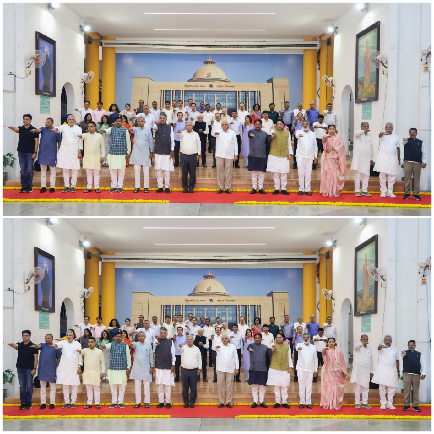 મુખ્યમંત્રી શ્રી ભૂપેન્દ્ર પટેલ તથા રાજ્ય મંત્રીમંડળના મંત્રીશ્રીઓ – મુખ્ય સચિવશ્રી તથા વરિષ્ઠ સચિવશ્રીઓ અને અધિકારીઓએ વિધાનસભા પોડિયમમાં યોજાયેલા સામુહિક પ્રતિજ્ઞા પઠનમાં જોડાઈને “ભારત વિકાસ પ્રતિજ્ઞા” લીધી હતી.