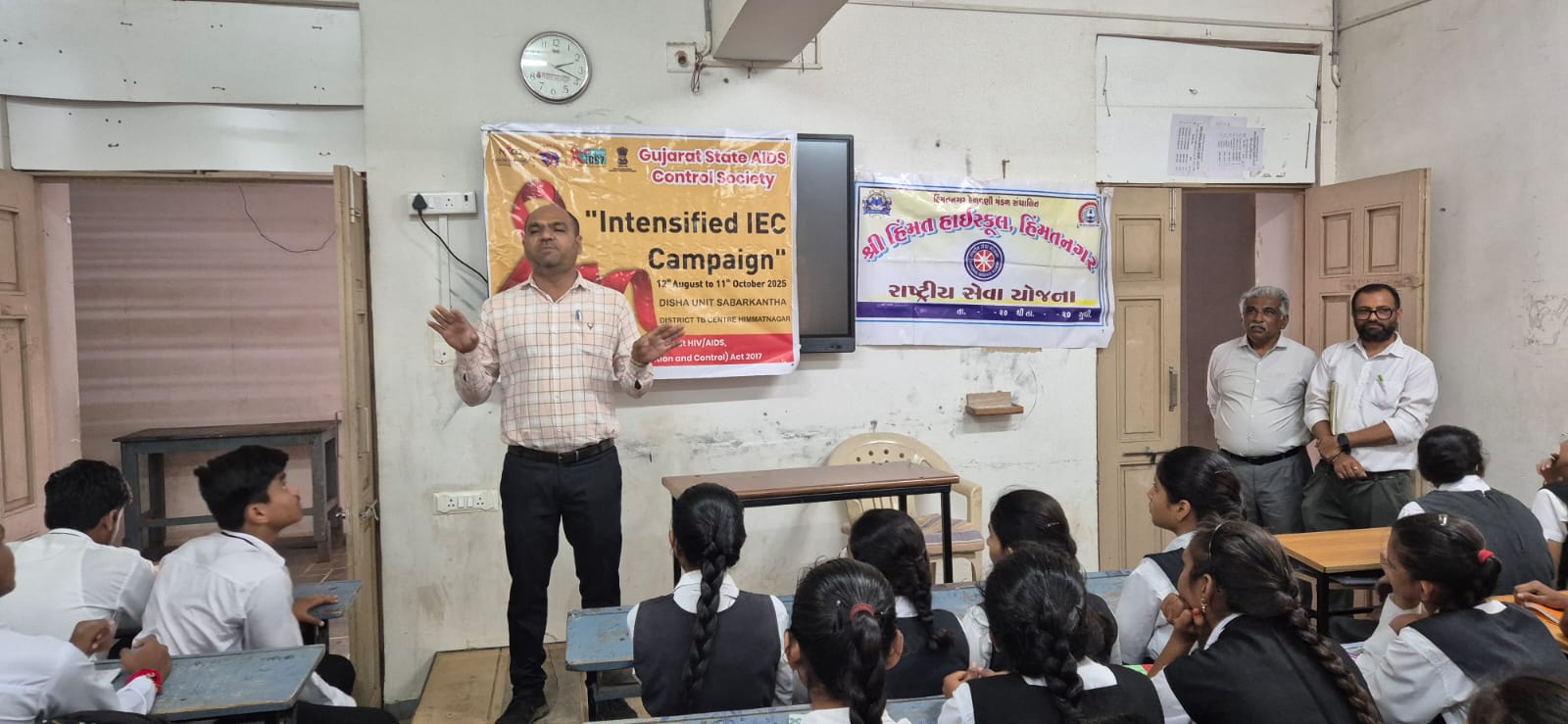 Intensified IEC Campaign અંતર્ગત આજ રોજ તા.22.8.25 ને શુક્રવારે મા. જિલ્લા ક્ષય અધિકારી મહેન્દ્રભાઈ પટેલ સાહેબના માર્ગદર્શન હેઠળ દિશા યુનિટ સાબરકાંઠામાંથી ક્લિનિકલ સર્વિસ ઓફિસર શ્રી રાહુલ પટેલ દ્વારા હિંમતનગરની હિંમત હાઈસ્કૂલમાં NSS વિભાગના સહકારથી એચઆઈવી એઇડ્સ જાગૃતિ કાર્યક્રમ યોજાયો.જેમાં ધોરણ 12 ના વિદ્યાર્થીઓને એચઆઈવી એઇડ્સ અંગેની બેઝિક માહિતી આપવામાં આવેલ હતી. જેમાં એચઆઇવી થવાના કારણો, એચઆઇવી અંગેની ગેરમાન્યતાઓ, એચઆઈવીથી બચવાના ઉપાયો ,એઆરટી દવાનું મહત્વ, જિલ્લામાં આવેલ HIV ટેસ્ટિંગ સેંટરની માહીતી,એચ.આઈ.વી. એઇડ્સ એક્ટ 2017 વિશે વિસ્તાર પૂર્વક માહિતી આપવામાં આવેલ હતી અને વિદ્યાર્થીઓના મુંજવતા પ્રશ્નોનું સચોટ માર્ગદર્શન આપવામાં આવેલ હતું . આ અવેરનેસ કાર્યક્રમમાં 200 થી વધુ વિદ્યાર્થીઓ હાજર રહેલા હતા. જેમાં શાળાના આચાર્યશ્રી સુરેશભાઈ પટેલ, NSS પ્રોગ્રામ ઑફિસર ડો.ધવલ પટેલ, સીનીયર શિક્ષક શ્રી સી.આર.પટેલ હાજર રહેલા હતા. વિદ્યાર્થીઓએ ખૂબ સુંદર માહિતી મેળવી.