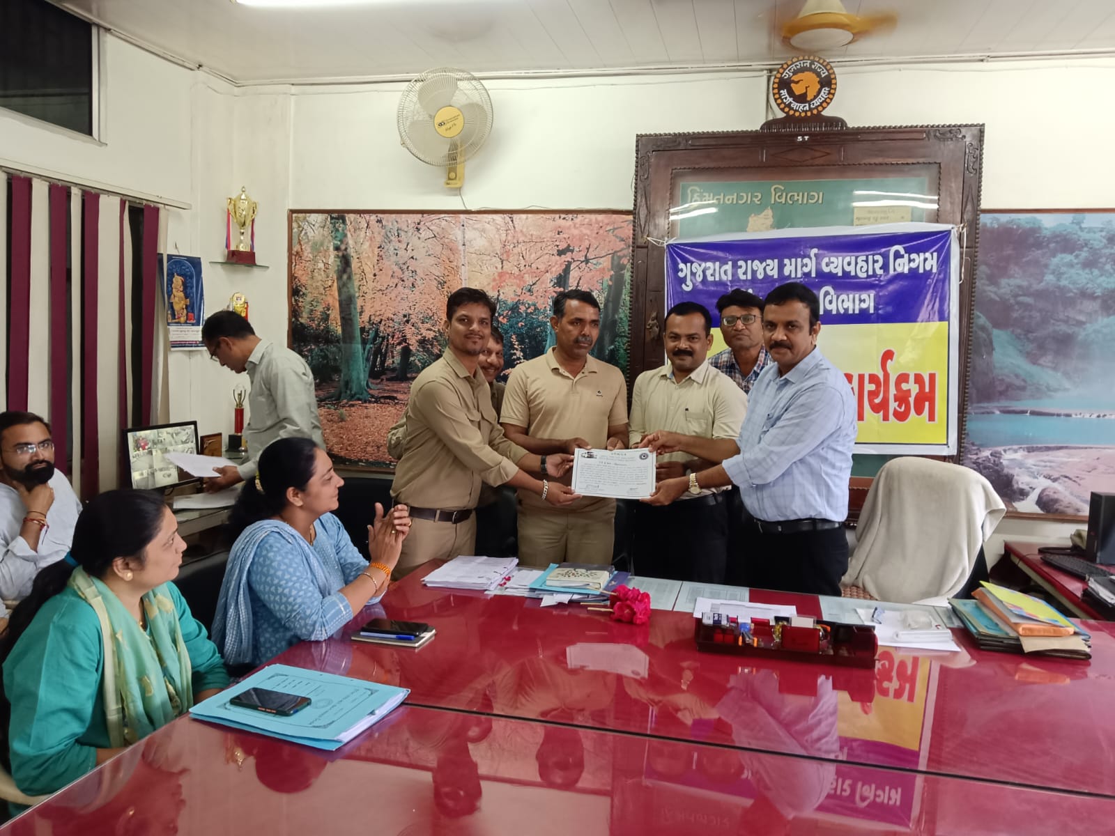 હિંમતનગર ડેપો ને આજ રોજ માનનીય વિભાગીય નિયામક શ્રી દ્વારા પ્રમાણપત્ર આપી સન્માન કરવા માં આવ્યુ