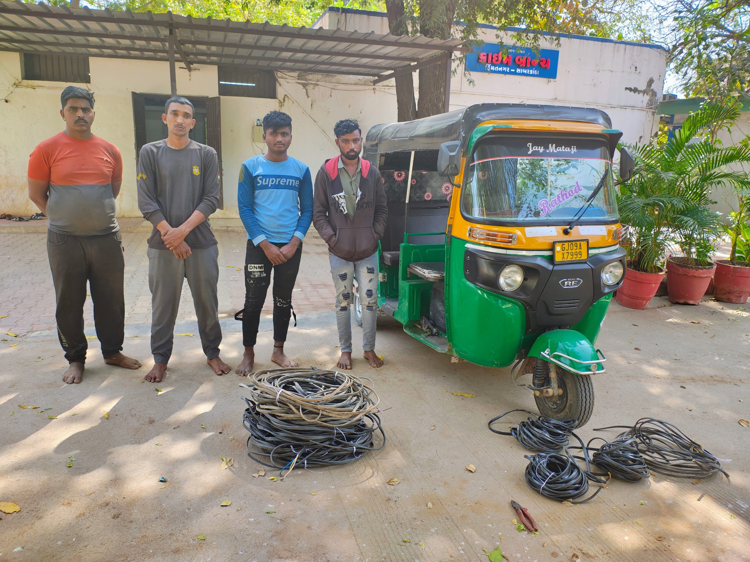 ચોરીનો મુદ્દામાલ રાખી એક ઇસમને આપવા સારૂ નવી સિવીલથી ગઢોડા રોડ ઉપર તા. હિંમતનગર ખાતે આવેલ છે.* જે બાતમી આધારે નવી સિવીલથી ગઢોડા રોડ ઉપર તા.હિંમતનગર ખાતે પહોંચી તપાસ કરતાં ઉપરોક્ત બાતમી મુજબની રીક્ષા મળી આવતાં સદર રીક્ષામાં જોતાં ત્રણ ઇસમો બેસેલ હોય તથા એક ઇસમ રીક્ષાની બહાર ઉભેલ હોય જે ચારેય ઇસમોને પોતાની હાજરી તથા રીક્ષાના કાગળો બાબતે પુછતા કોઈ સંતોષ કારક હકિકત જણાવતાં ન હોઇ જેથી સદરી રીક્ષામાં બેસેલ ઇસમોનું નામઠામ પુછતાં પોતે પોતાનું નામ (૧) મનહરસિંહ પુંજસિંહ કોદરસિંહ રાઠોડ ઉ.વ.૨૬ રહે.માઢા પો.મોયદ તા.પ્રાંતિજ જી.સાબરકાંઠા (૨) અશ્વીનસિંહ ચંપકસિંહ ગુમાનસિંહ રાઠોડ ઉ.વ.૨૪ રહે.માઢા પો.મોયદ તા.પ્રાંતિજ જી.સાબરકાંઠા (૩) રાહુલસિંહ લક્ષ્મણસિંહ કરણસિંહ રાઠોડ ઉ.વ.૧૯ રહે.માઢા પો.મોયદ તા.પ્રાંતિજ જી.સાબરકાંઠાનો હોવાનું જણાવેલ તેમજ રીક્ષાની બહાર ઉભેલ ઇસમનું નામઠામ પુછતાં પોતે પોતાનું નામ (૧) મદનલાલ બાબુલાલજી પ્રજાપતિ ઉ.વ.૨૩ હાલ રહે.પુનમભાઈ પ્રજાપતિના મકાનમાં ભાડેથી શારદાકુંજ સોસાયટી તા. હિંમતનગર જી.સાબરકાંઠા મુળ રહે.કોલાખેડા તા.આમેટ જી.રાજસમંદ રાજસ્થાનનો હોવાનું જણાવેલ સદર મળી આવેલ રીક્ષાની જડતી તપાસ કરતાં રીક્ષામાંથી એક વાદળી કલરની પ્લાસ્ટીકની કોથળી તથા સફેદ કલરની પ્લાસ્ટીકની કોથળી મળી આવેલ જે બન્ને કોથળીઓ ખોલી જોતાં જેમાથી કાળા કલરના ઇલેક્ટ્રીક કેબલ વાયરો મળી આવેલ જેથી સદરી ચારેય ઇસમોની હાજરી તથા તેઓ પાસેથી મળી આવેલ કેબલ વાયર સંબધે પુછતાં રીક્ષામાં બેઠેલ ત્રણ ઇસમોએ જણાવેલ કે, અમો ત્રણેય જણાં બે દિવસ પહેલાં મનહરસિંહ પાસેની રીક્ષા લઇ દાદરડા ગામ તા.તલોદ મુકામે રાત્રીના સમયે ગયેલ અને અલગ અલગ ત્રણેક બોર/કુવાઓ ઉપરથી ઇલેક્ટ્રીક કેબલ વાયરની ચોરી કરેલ અને તે કેબલ વાયરો આજરોજ રાયકાનગર હિંમતનગર ખાતે ભંગારની દુકાનવાળા મદનલાલ બાબુલાલ પ્રજાપતિને ગઢોડા રોડ ઉપર વેચાણ કરવા માટે આવેલ હતાં તે સિવાય અમો ત્રણેય ઉપરોક્ત ચોરી સિવાય નીચે મુજબની ચોરીઓ કરેલ છે.