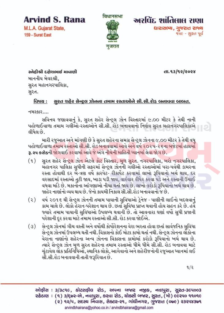 સુરતના પૂર્વ વિધાનસભાના ધારાસભ્ય અરવિંદ રાણાએ મેયર દક્ષેશ માવાણીને પત્ર લખી 9 મીટર કે તેથી વધુ પહોળાઈના રસ્તા માટે સીસી રોડ બનાવવાની માગ કરી છે. આ માંગણી સાથે તેઓએ પત્રમાં કહ્યું કે, આગામી બજેટમાં સેન્ટ્રલ ઝોનમાં 9 મીટર કે તેથી વધુ પહોળાઈવાળા તમામ રસ્તાઓ સીસી રોડના બનાવવાની જોગવાઈ કરવામાં આવે. સેન્ટ્રલ ઝોનની ગલી-રસ્તાઓ તૂટી જાય, ખાડા પડી જાય, વારંવાર રીપેર કરવા પડે અને રસ્તાની ઊંચાઈ વધવા લાગે છે. મકાનના આંગણા નીચા થતાં જાય છે. લાખો કરોડો રૂપિયાનો ખર્ચ થાય છે અને જાહેર નાણાંનો વ્યય થાય છે. જેનો ઉકેલ સીસી રોડ બનાવીને થઈ શકે છે.