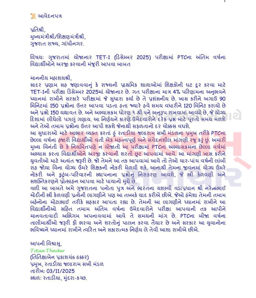 રતાડીયા, તા. ૩ : ગુજરાત રાજ્યની પ્રાથમિક શાળાઓમાં શિક્ષકોની પૂરતી સંખ્યા જળવાઈ રહે અને યુવા પેઢીને શિક્ષક તરીકે કારકિર્દી બનાવવાની તક મળી રહે તે માટે એક મહત્ત્વપૂર્ણ રજૂઆત કરવામાં આવી છે. રાજ્યના પ્રાથમિક શિક્ષક તાલીમ અભ્યાસક્રમ (પી.ટી.સી. અથવા ડી.એલ.એડ.)ના અંતિમ વર્ષમાં અભ્યાસ કરી રહેલા વિદ્યાર્થીઓને આગામી શિક્ષક યોગ્યતા કસોટી (ટેટ-૧) ડિસેમ્બર ૨૦૨૫ની પરીક્ષામાં બેસવા માટે મંજૂરી આપવા માટે માનનીય મુખ્યમંત્રીશ્રી અને શિક્ષણમંત્રીશ્રીને રતાડીયા જલારામ સખી મંડળના પ્રમુખ તિતિક્ષાબેન ઠક્કર દ્વારા આવેદનપત્ર પાઠવી રજુઆત કરવામાં આવી છે. આવેદનપત્રમાં જણાવ્યા મુજબ અગાઉ ૨૦૨૩ની ટેટ-૧ પરીક્ષાનું પરિણામ માત્ર ૪% જેટલું નીચું આવ્યું હતું જે સ્પષ્ટ દર્શાવે છે કે રાજ્યમાં ગુણવત્તાયુક્ત શિક્ષકોની ભરતી માટે વધુ ઉમેદવારોને તક આપવી અત્યંત જરૂરી છે.