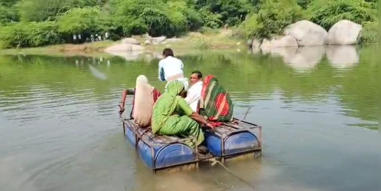 અલાલી ગામ થી વાંટા તરફ જવા માટે પ્લાસ્ટિક ના બેરલ થી બનાવેલ અનોખી નાવડી નો સહારો લઈ જીવના જોખમે નદી પાર કરવા મજબૂર ગ્રામજનો.!!