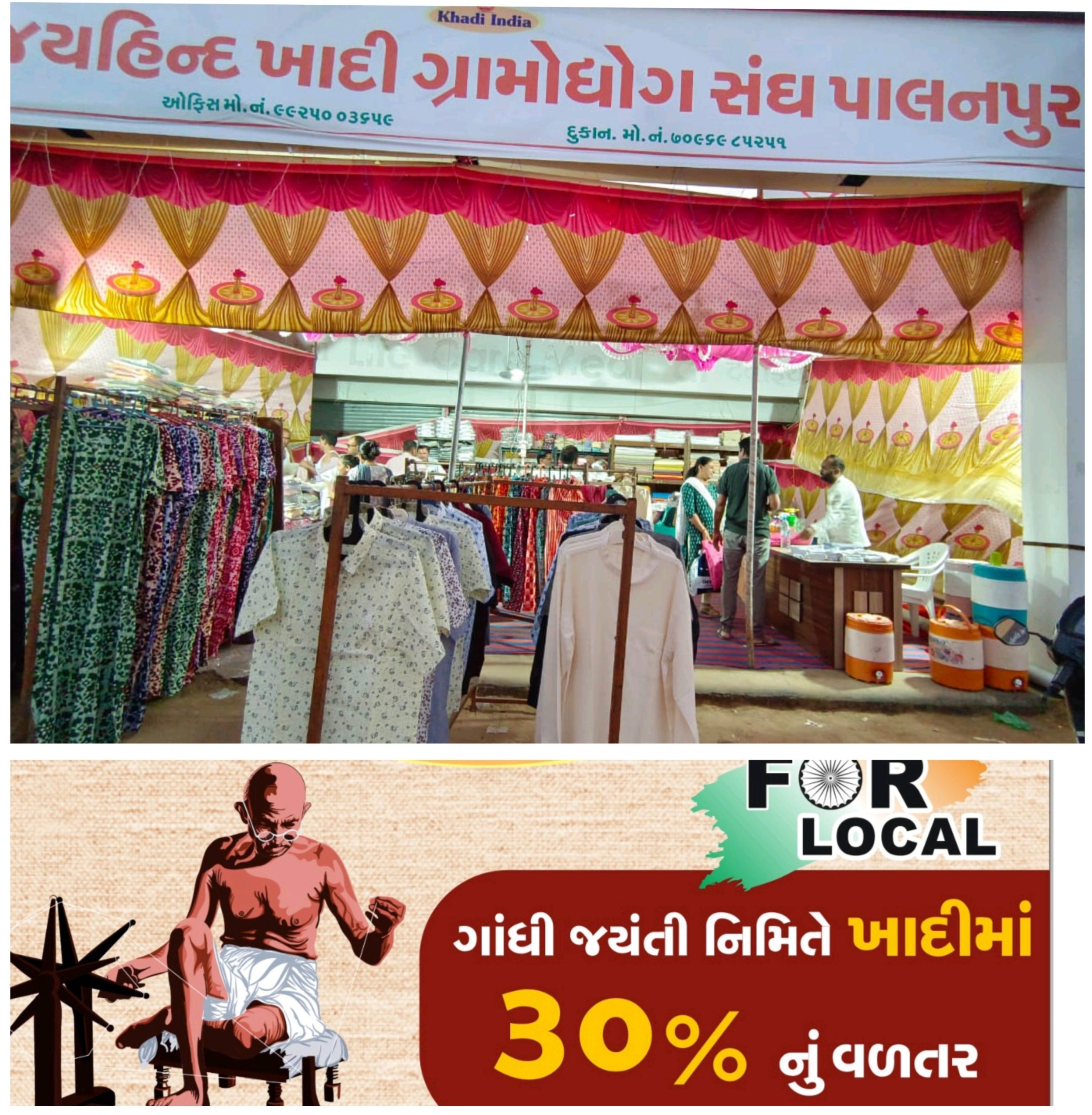 પાલનપુર એરોમા હાઈવે સર્કલ નજીક આવેલી હાઈવે બસસ્ટેશન ની બાજુમાં આવેલા પહેલાં જે જગ્યાએ લાઈફ કેર મેડિકલ આવેલ હતી પરંતુ તે ઘણા સમયથી ખાલી પડેલી જગ્યામાં બીજી ઓક્ટોબરે ગાંધીજયંતી નિમિત્તે જય હિન્દ ખાદી ગ્રામોદ્યોગ સંઘ ની બીજી શાખાની શરુઆત કરવામાં આવેલ હતી જેમાં લોકો અત્યારે ખાદી માં 30% વળતર નો લાભ મેળવી રહેલા જોવા મળે છે જ્યાં અલગ અલગ પ્રકારની વેરાયટી જોવા મળે છે જેમાં ખાદીના વસ્ત્રો લેગા,ચાદર, ટુવાલ, ડ્રેસ મટીરીયલ, ઓશિકા કવર અને અન્ય ઘણા પ્રકારના ખાદી તથા પોલીવસ્ત્રો ની વેરાયટી જોવા મળે છે અને લોકો વળતર નો લાભ મેળવી રહેલા છે તેવું નરેશભાઈ પ્રજાપતિ એ જણાવ્યું હતું.આની મુખ્ય શાખા એગોલા રોડ પર આવેલી જોવા મળે છે.